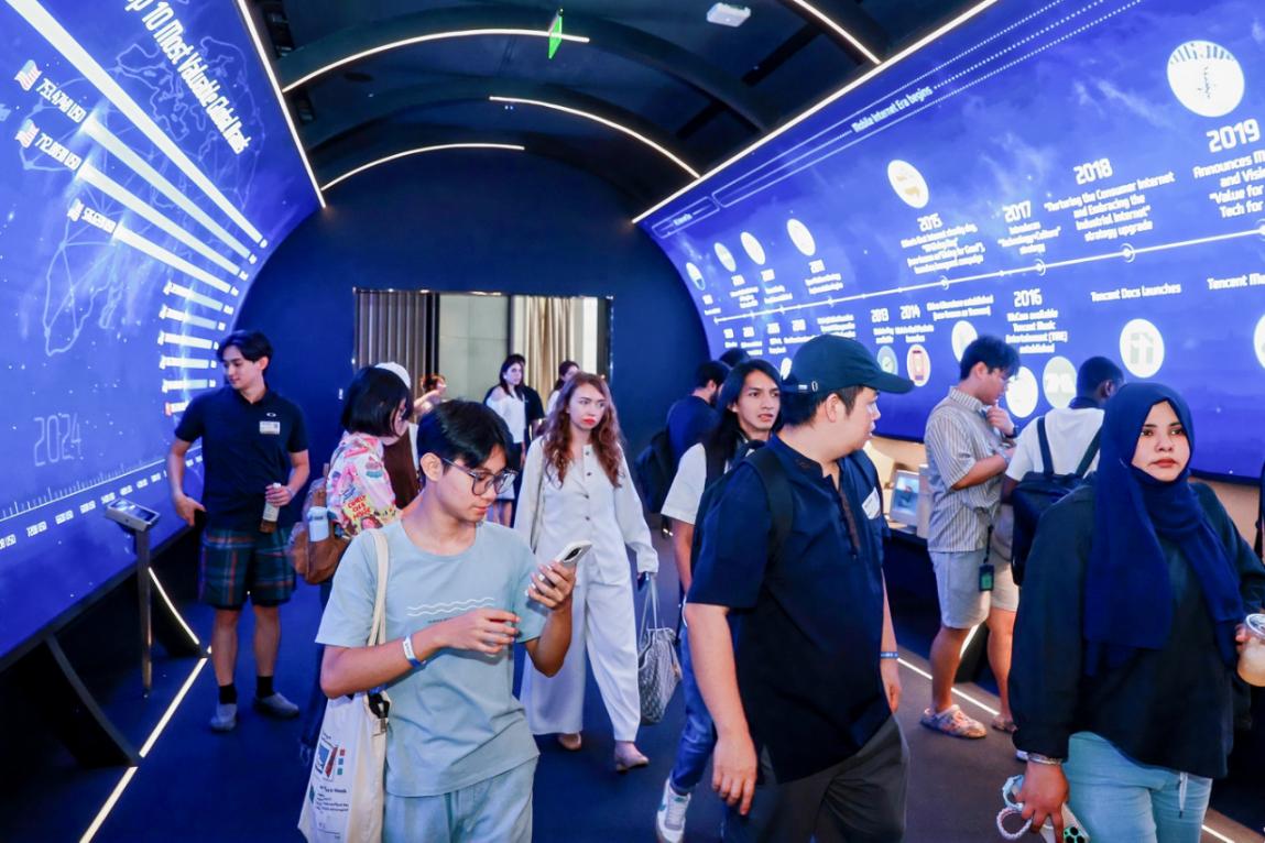 This smart building, hailed as an "Internet landmark", immediately caught the students' eyes with its streamlined appearance and tech-savvy design. Led by a guide on the first floor, the international students first visited the Tencent exhibition hall. Inside, from the iterative development of national-level products like QQ and WeChat to the application scenarios of cutting-edge technologies such as cloud computing, artificial intelligence, and digital twins, it vividly demonstrated Tencent's mission of "Technology for Good" and its global layout. The international students exclaimed, "We never expected that Tencent's technology has permeated every aspect of life."