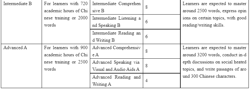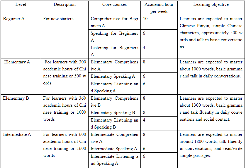Comprehensive Chinese, Speaking, Reading and Writing, Speaking via Visual and Audio Aids, etc. to be offered based on different levels |