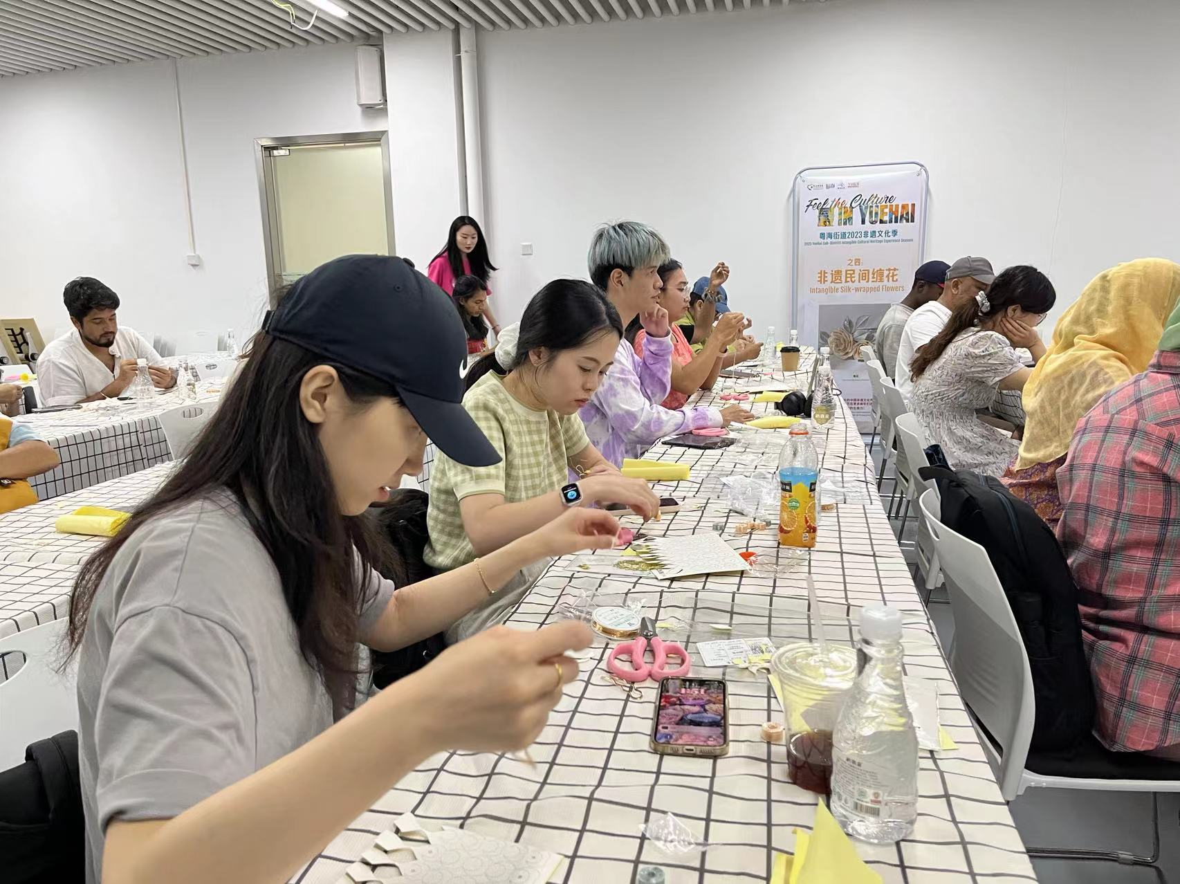 First of all, the lecturer explained the origin and development significance of non-heritage rope knitting for the international students, and showed the exquisite art of rope knitting. One piece of rope weaving art ignited the enthusiasm of the international students, and then the main teacher demonstrated the basic operation process of knitting, leading everyone to weave simple small red flower rope weaving handicraft step by step from the basic step. "Hand rope weaving must be patient, must not be anxious, we must master the skills", the lecturer carefully demonstrated the rope weaving techniques, one color rope in the skillful hand flipping, shuttling. The international students listened carefully to the explanation, memorized the steps and techniques in their minds, and turned to their own hands to make them, carefully shuttling the ropes back and forth between their fingers, and discussing their learning experiences with each other. When in trouble, you teach me, I help you, the scene is full of joy and joy atmosphere.