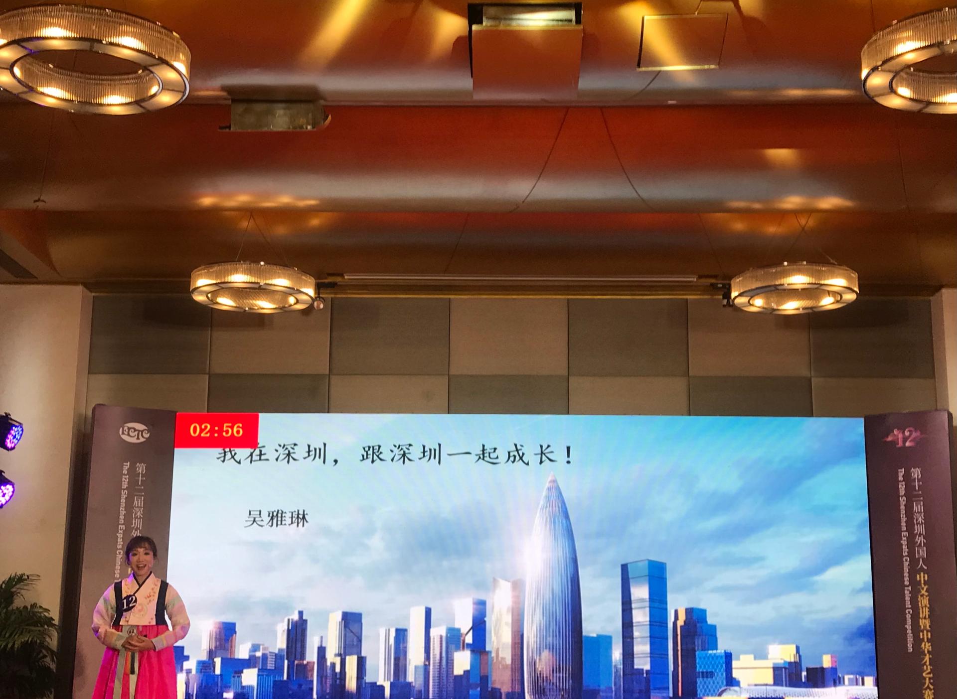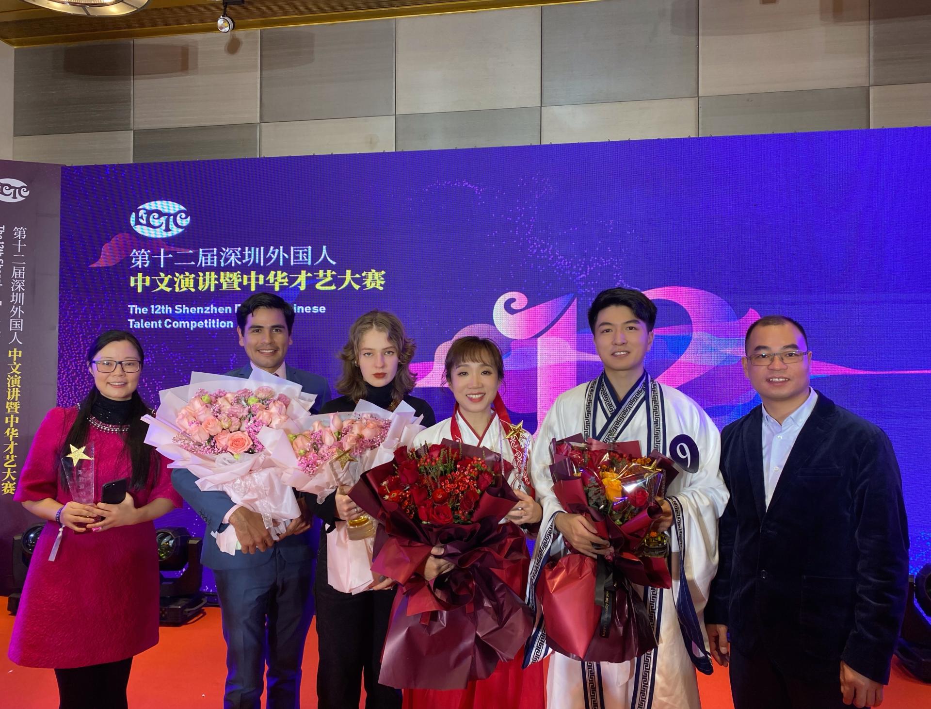 十二月五日,第十二届深圳外国人中文演讲暨中华才艺大赛决赛在南山区益田威斯汀酒店举行,比赛现场气氛热烈。经过激烈的角逐,深圳大学国际交流学院汉语国际教育硕士专业的吴雅琳(韩国、一年级研究生)、金问哲(韩国、一年级研究生)分别获得一等奖和二等奖,安娜(俄罗斯、三年级研究生)和成涵(墨西哥、一年级研究生)获得了优秀奖,深圳大学国际交流学院也因此得到了“最佳组织奖”的称号。