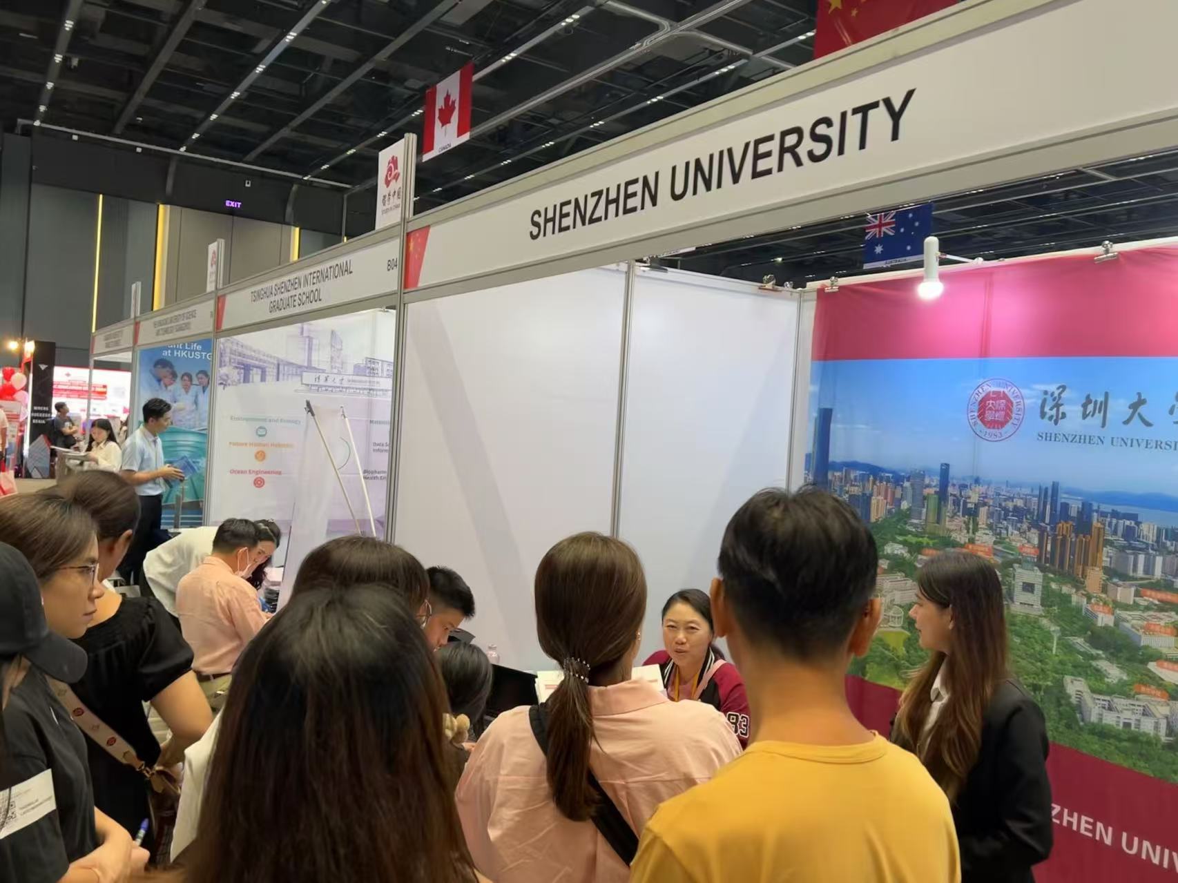 深圳大学国际交流学院邱欢老师、黄巍老师代表深圳大学为有意来华留学的学生详细介绍学校情况、校园环境、入学条件、奖学金申请等内容,耐心解答学生及其家长的提问,同时也向现场咨询的国际学生发出了诚挚邀请。学生们在深圳大学展位前排队咨询,一些学生也表达了留学深大意向。