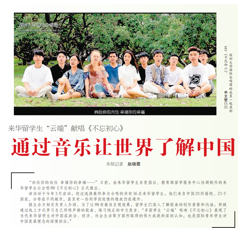 2021年7月23日,《人民日报(海外版)》对深圳大学国际合唱团牵头制作的云合唱MV《不忘初心》进行了专题报道。该MV由教育部留学服务中心委托深圳大学国际合唱团牵头组织制作,来自国内20所高校的23国来华留学生共同演绎,歌曲是由深圳大学国际合唱团团长申文燮负责制片、监制和编曲。