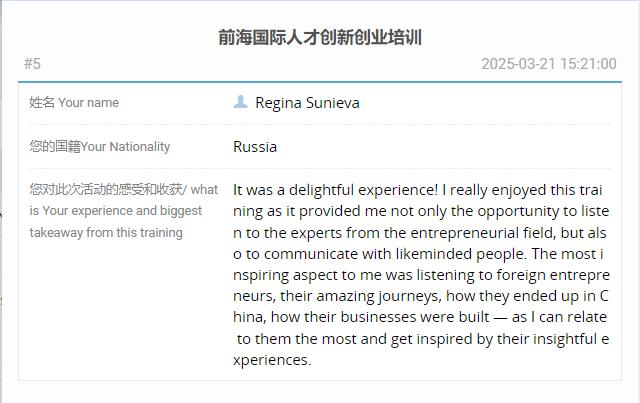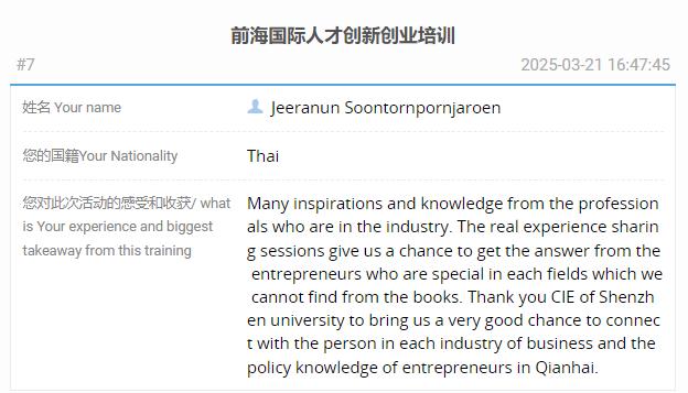 The College of International Exchange at Shenzhen University selected 16 international student representatives with entrepreneurial potential to participate in the "International Talent Innovation and Entrepreneurship Training" program held in Qianhai from March 18th to 20th. During the three-day immersive training, the students engaged in face-to-face discussions with several successful entrepreneurs, systematically learning the core elements of entrepreneurship and gaining insights into the innovation and entrepreneurship ecosystem as well as talent support policies in the Guangdong-Hong Kong-Macao Greater Bay Area. Throughout the program, the students not only expanded their global perspectives and built valuable professional networks but also stimulated innovative thinking through in-depth exchanges with peers from diverse academic and cultural backgrounds. This training program has established a high-quality learning platform for innovation and entrepreneurship, laying a solid foundation for the participants' future career development and entrepreneurial pursuits.