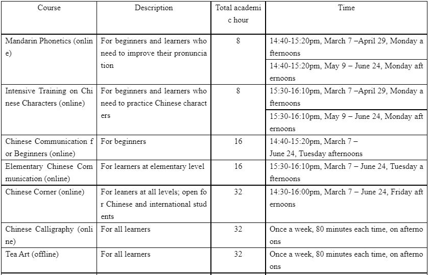 Online courses: Chinese Communication for Beginners, Elementary Speaking, Mandarin Phonetics, Intensive Training on Chinese Characters, and Chinese Corner |