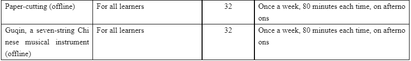 Offline courses: Chinese Calligraphy, Tea Culture, Papercutting, etc. |