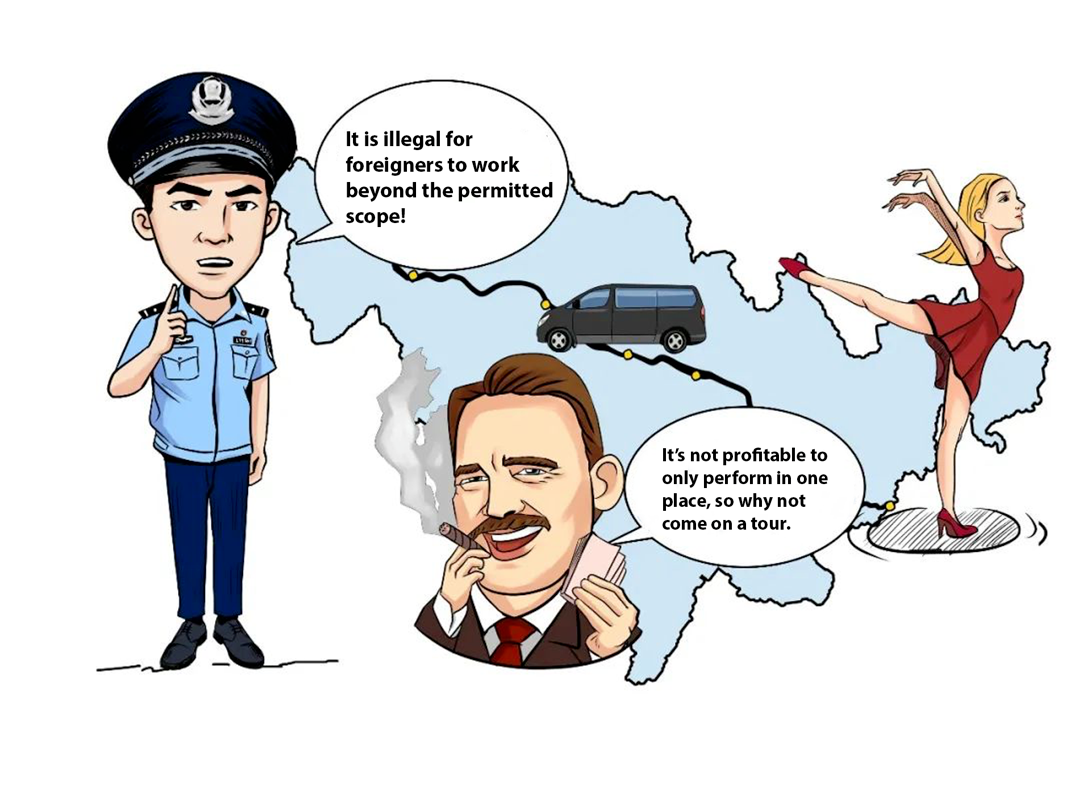 Group of foreign dancers was checked by the immigration police and noticed that only one of them have legal document to work. They were fined 50000 yuan and their illegal income was confiscated.
