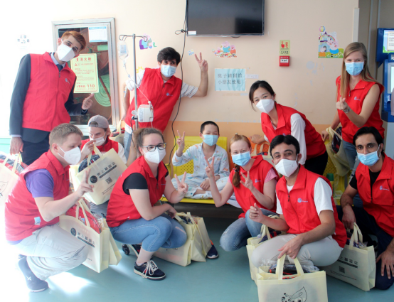 在血液科刘四喜主任的带领下,外国留学生志愿者们先后来到了血液科病区,为百余名患儿送去礼物。