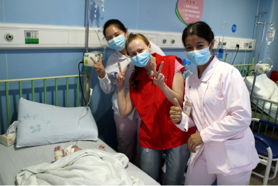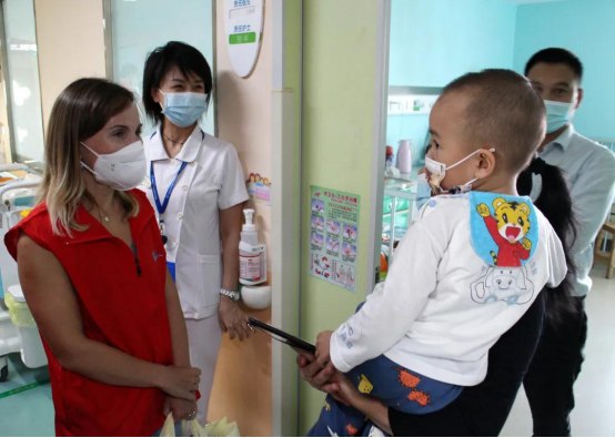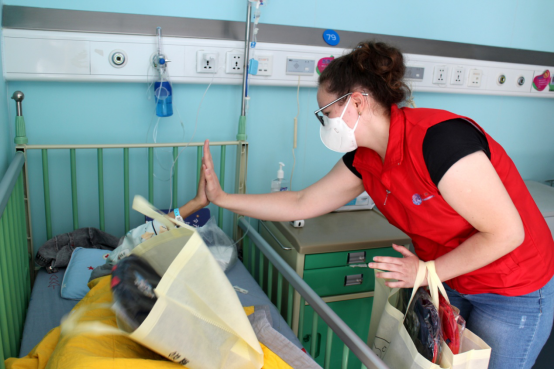 外国志愿者们说着流利的中文,一扫病房内紧张的气氛,拉近了与小朋友之间的距离。有的小朋友非常友好,一见外国人就马上从床上坐起来,伸手要和志愿者握手,嘴里还不忘用英语问候:“Hello!What is your name?” 有的孩子一接过礼物,迫不及待地把帽子戴在头上,背起小书包在病房里得意地走起了台步,在场的人都忍俊不禁。