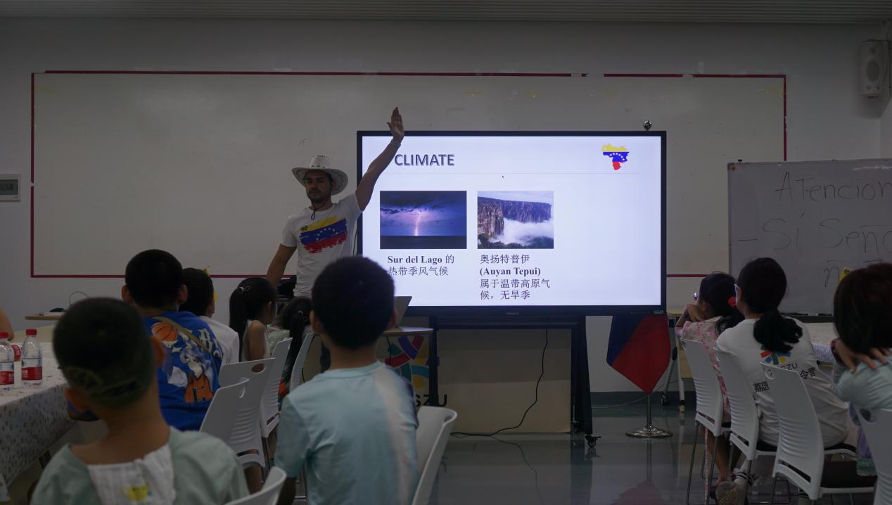 热情活泼的委内瑞拉约翰老师(VARGAS QUERALES JHON FRANK)用他诙谐幽默的话语,生动形象的肢体动作与丰富的神态表达,令小朋友们在阵阵欢笑声中熟悉了委内瑞拉这个充满了神秘色彩的国度。