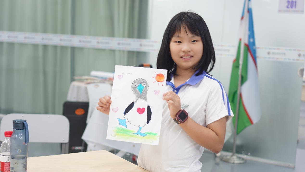 来自厄瓜多尔的艾莉老师(OLIVO BARZALLO GENESIS ELIZABETH)首先介绍了厄瓜多尔的特色风光和美食,然后摇身一变,身着民族特色服饰,带领小朋友一起舞动,绕成圆圈跳起特色舞蹈。大家一起用油画棒绘制出厄瓜多尔国鸟蓝腿鲣鸟,小朋友们都开心地和大家分享自己的作品。