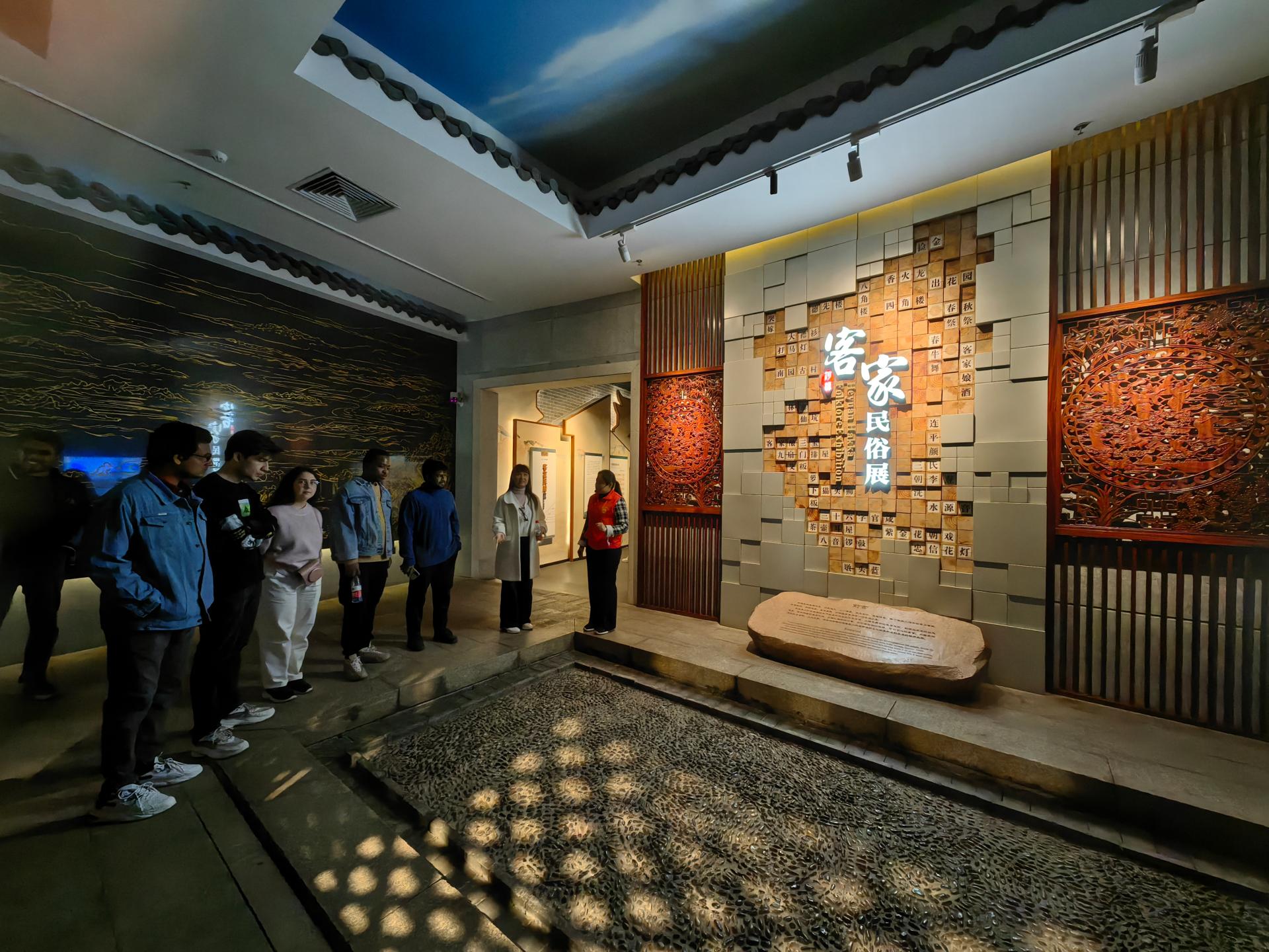 在河源客家文化公园,在带队老师带领和讲解下,同学们一边走一边了解客家文化和体验当地生活,感受了当地客家人的生活状态。在河源市博物馆,同学们参观了客家文物的展览和介绍,讲解员仔细认真地讲解着展览中的文物,带队老师当起了翻译,耐心细致地向同学们介绍着客家历史,同学们纷纷凑前上来仔细聆听,听得津津有味。