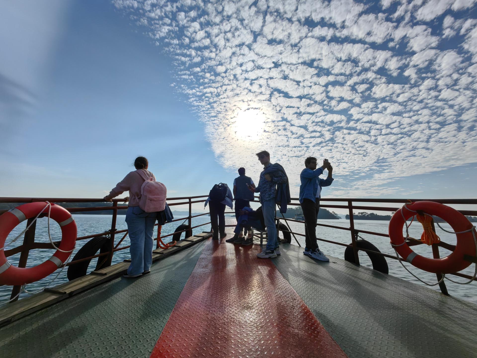 同学们先是登上船舶,面迎着和熙轻柔的清风、呼吸着沁人心脾的空气、沐浴着温暖恬静的阳光,观赏和感受着这美丽的万绿湖,惊叹于万绿湖面积之宽大、湖水之清澈、天空之湛蓝、树木之葱郁。随后,同学们登上小岛,先后参观了水文化科普馆、观看了“非遗”节目展演等,带队老师讲解着万绿湖的概况,让同学们进一步了解河源万绿湖的文化和历史。