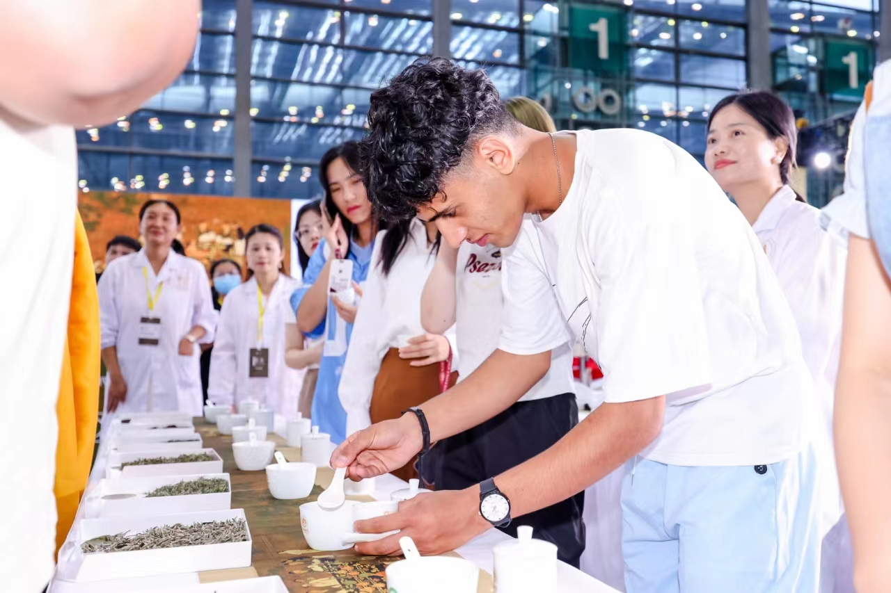 场馆里,琳琅满目,种类繁多的茶,精美的茶器,跟茶相关的周边吸引着同学们的目光。我们直接前往绿茶和红茶的品鉴区。坐下来,大屏幕上正在进行茶区的介绍,江西九江,庐山之上,环境优美,云雾缭绕,风景宜人;茶园之中,白云深处,翠绿满满,芽肥叶嫩,摇曳生姿。庐山云雾,历史悠久,精品绿茶。渐渐安静下来,看茶艺师冲泡绿茶,精准把控水温,下投茶叶,沿着盖碗的杯壁注水,慢慢出汤。很快,大家都喝上了茶,这一口滋味鲜爽,解暑又提神,同学们由衷感叹这款绿茶不错,很好喝。置于眼前漂亮的茶果子,一开始都以为是假的,只是装饰品而已,不料茶艺师告诉大家是可以吃的茶点,大家既惊讶又开心,热情的恩迪主动切开,让大家一起分享这美丽又美味的点心。喝着茶吃着点心,看着茶艺表演,听着茶历史,还有精致的小礼物,同学们都非常开心。第二款红茶跟汤色明亮的庐山云雾绿茶不一样,庐山宁红呈现了红茶的独特韵味,橙红的色泽,甜香花果香,韵味绵长。几杯喝下,大家都纷纷点赞,称道中国的绿茶和红茶都非常不错。