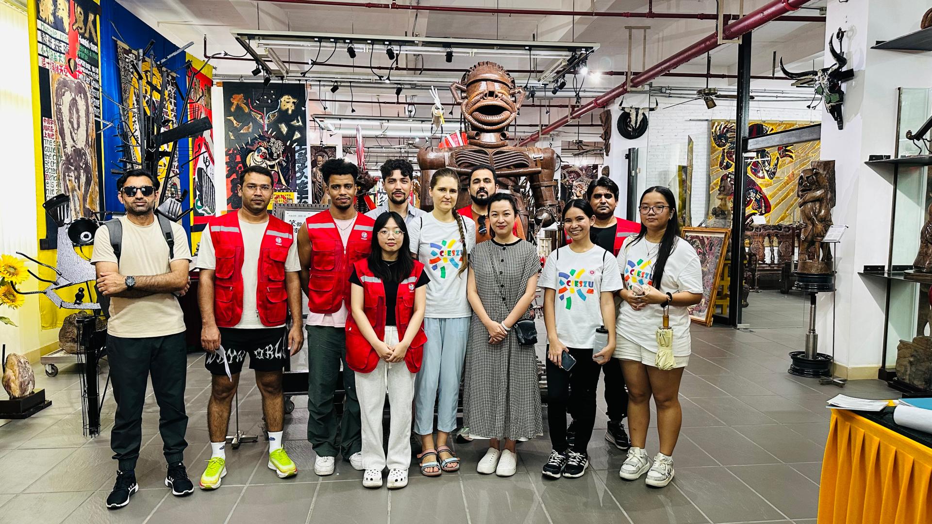 活动以三号艺栈为起点,这座由旧厂房改造而成的艺术原创基地,如今已成为深圳大学的文化地标。在三号艺栈的四楼,李瑞生老师的艺术展厅如同一颗璀璨的明珠,展示着过百件原创艺术作品和珍贵藏品。从文化探秘的奇妙之旅,到俗语新解的智慧火花,再到吉祥物创意的灵动呈现,每一件作品都承载着深厚的文化底蕴和艺术价值,激发了新生们对艺术的无限热爱与向往。其中,《笑傲人生》这一金属焊接艺术品,以乐观向上的残疾人形象,生动诠释了生命的坚韧与不屈,让新生们深受感动。