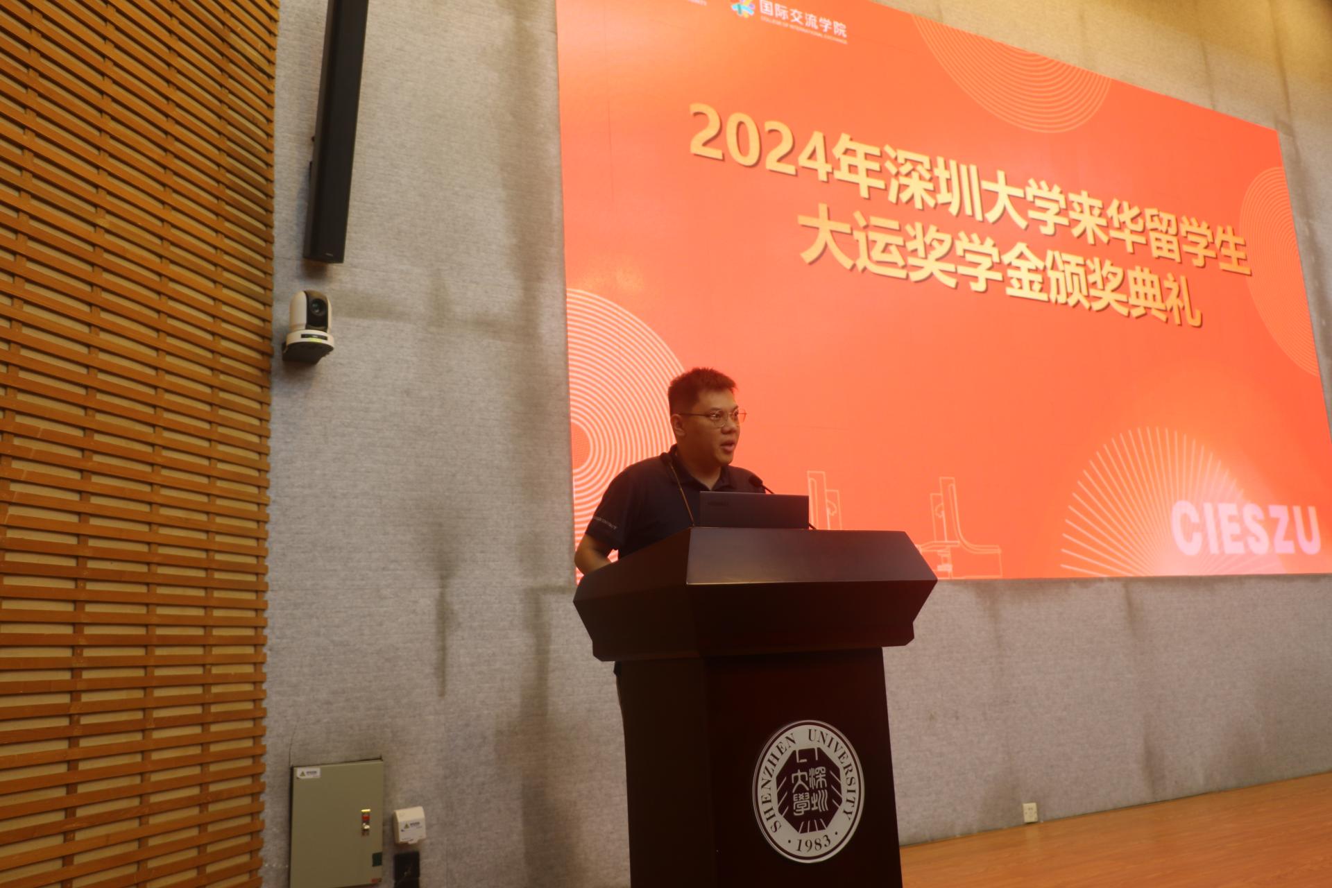 近日,深圳大学2024年来华留学生大运奖学金颁奖典礼在汇星楼2号报告厅举办,旨在表彰在学习和文化交流方面表现突出的留学生,并鼓励他们继续努力学习,成为中外友好的使者。深圳大运留学基金会秘书长陆林、国际交流学院副书记秦晴、深圳大学国际交流学院学生事务办公室主任刘威、大运基金会和国际交流学院相关负责工作人员、获奖学生及家属、留学生新生等共计100余人出席了活动现场。国际交流学院学生事务办公室主任刘威主持了典礼。