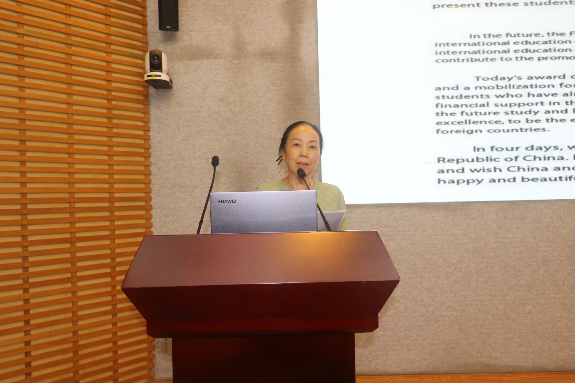 颁奖典礼首先由大运基金会陆林秘书长致辞。陆林秘书长在致辞中介绍基金会2024年的资助名单中,深圳大学除“2024荔园之行夏令营”项目成为首批获资助的来深短期国际教育交流项目外,还有72名中外留学生获得资助。其中来华留学生64位,42位来中国境内攻读学历教育、22位来深学习汉语,这些同学来自全球25个国家。她表示,在未来基金会将持续推动国际教育交流的深入发展,为更多高品质国际教育交流项目、更多优秀国际学生提供资助机会,为促进中外教育合作交流贡献力量,并对来华留学生们所取得的优异成绩表示衷心的祝贺。