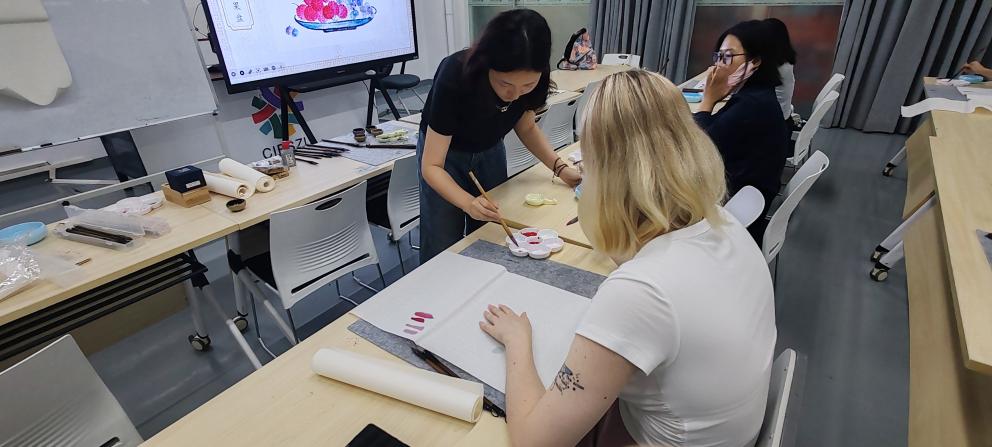 他们耐心地指导学生们如何调色、如何运笔,以及如何通过笔墨的浓淡干湿来表现物体的形态与质感。学生们全神贯注地听着老师的讲解,细心地观察着每一笔每一划的变化,用心去感受着国画的独特魅力与意境之美。