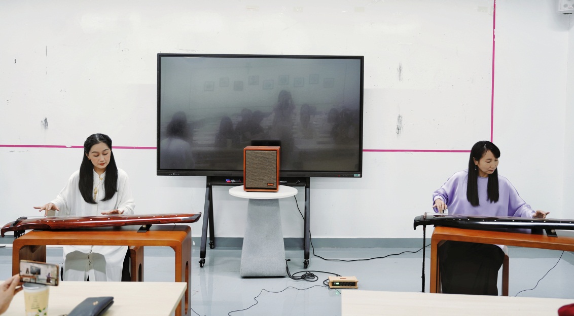 在演奏环节,芮老师弹唱了自己编曲的琴歌《一剪梅·舟过吴江》,随后她独奏了传统曲目《醉渔唱晚》,最后与学生共同演绎了古琴二重奏《残月》。这些曲目不仅展示了古琴音乐的多样性,也让观众深刻体会到了古琴音乐与戏曲等不同艺术类型的相通之处。