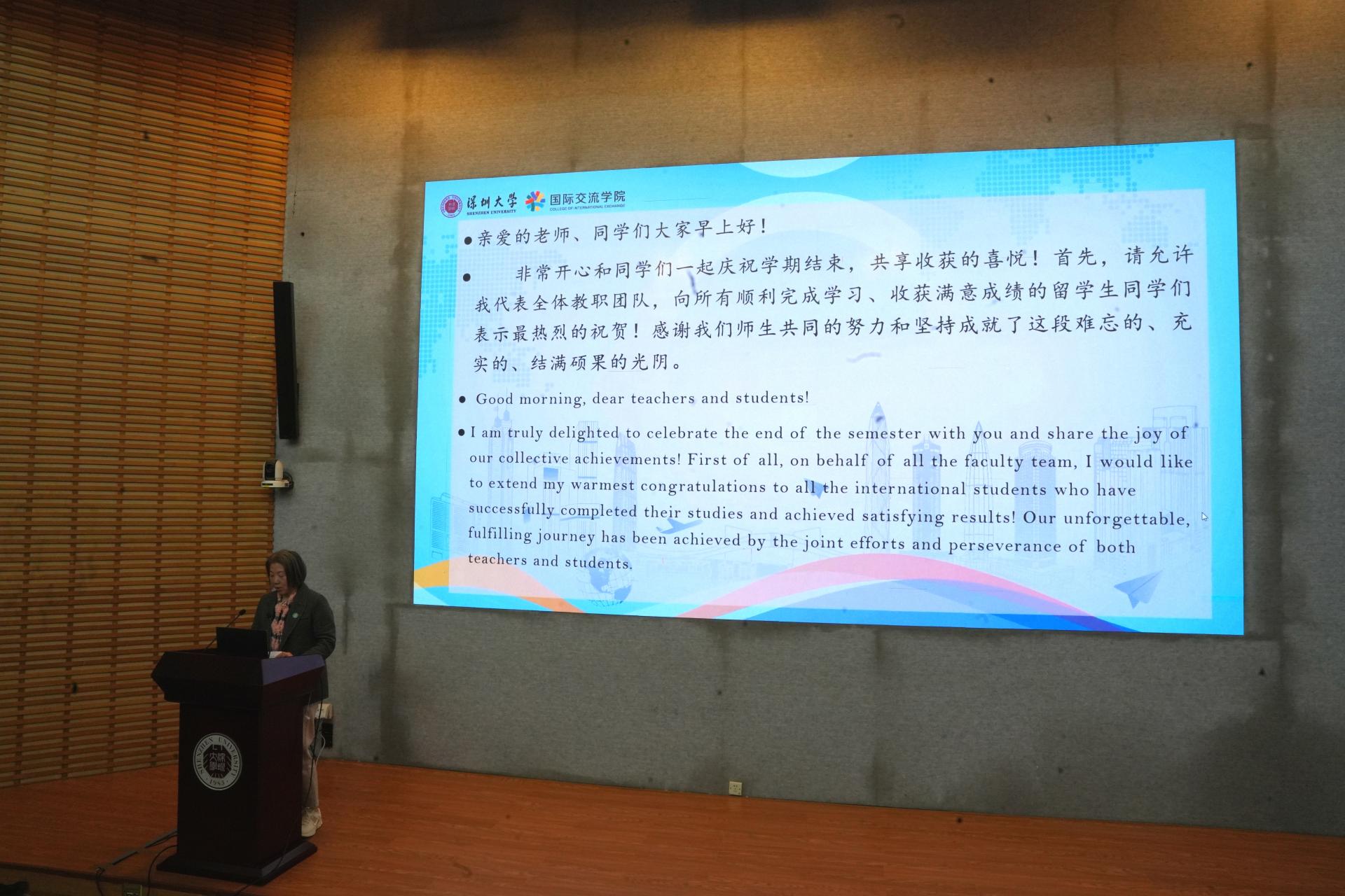 愉快的氛围中郑捷副院长发表致辞。她首先送上了对所有顺利完成学习、收获满意成绩的留学生同学们最热烈的祝贺。希望同学们在之后的人生路程中继续提高,奋楫笃行,发挥国际校友纽带的作用,为构建中外友好关系贡献力量。“学无止境,气有浩然”,愿同学们去拥抱更加广阔的天空,书写属于自己的精彩篇章。