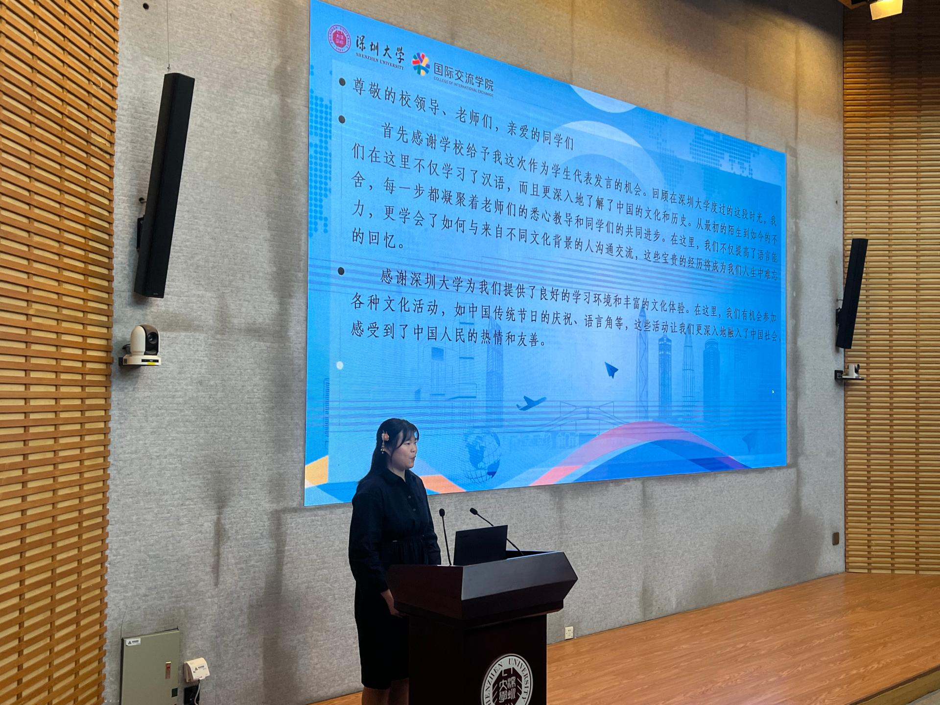 学生代表干场翔太同学(中级2班)和余谱月同学(高级班)也分别上台发言。他们分享了自己的学习心得和感悟,表达了对学院、老师们和同学们的感谢,并表示这将是他们难忘的人生经历。