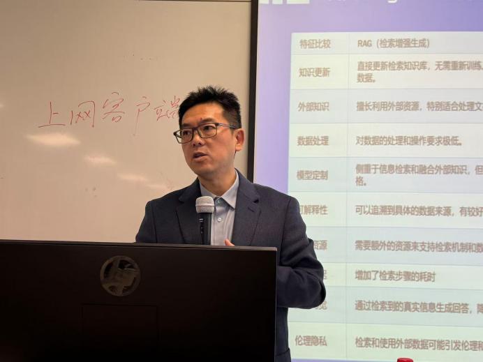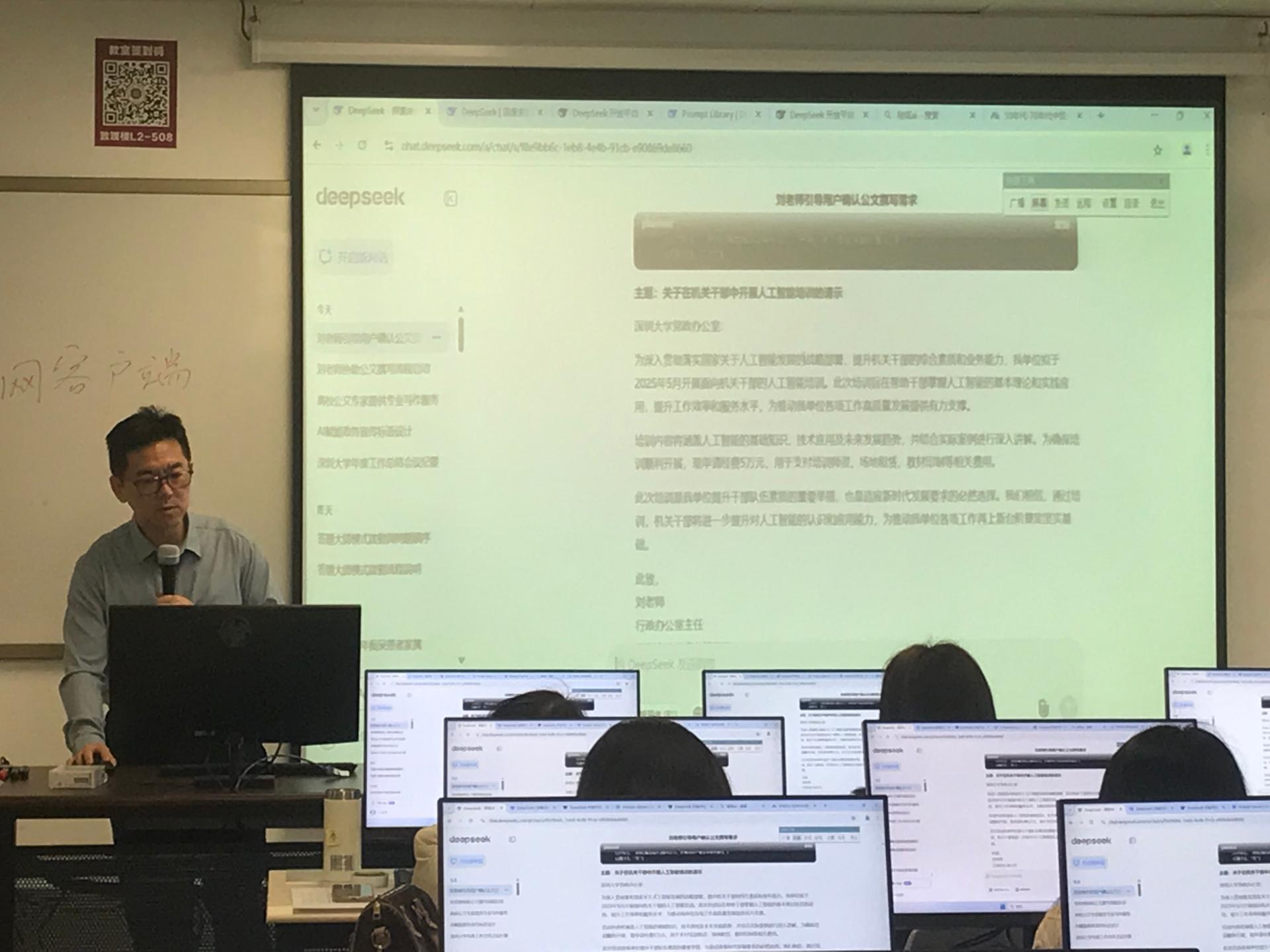 培训会上,刘锐老师凭借深厚的专业知识,系统介绍了当前AI大模型的核心能力以及行业发展趋势。重点围绕国产化AI工具DeepSeek,详细解析了其技术优势。DeepSeek借助“开放生态+低成本+高性能”的模式,支持多语言处理、上下文感知以及多模态内容生成,可广泛应用于文件撰写、政策解读、数据分析等行政办公的高频场景。考虑到国际交流学院的特殊需求,刘老师特别演示了AI在跨语言沟通方面的实践应用。通过WPS灵犀集成DeepSeek R1模型,教师能够快速生成中英文双语活动方案,自动解析外文政策文件,还能一键制作符合国际化学术规范的PPT,极大地缩短了跨文化交流时的信息处理时间。