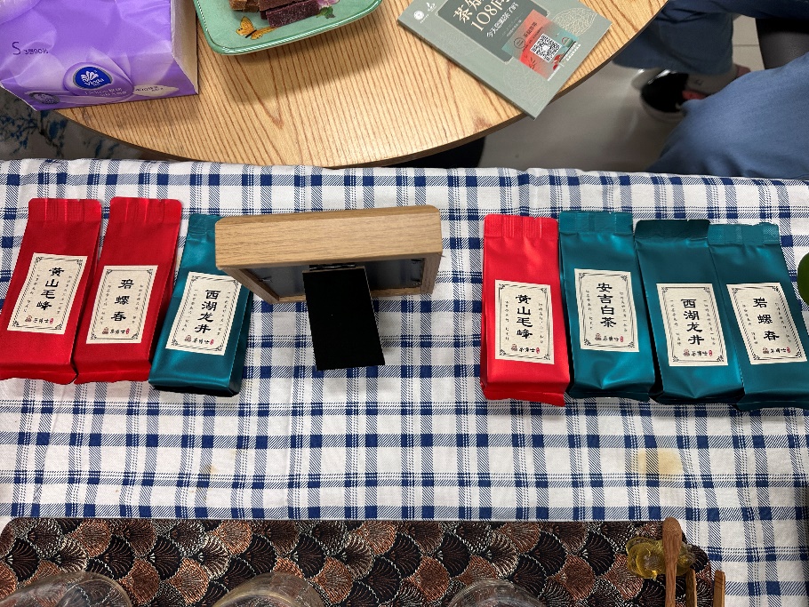 鞠梅老师生动讲解了绿茶的四大传统工艺——"炒青、烘青、晒青、蒸青",每一道工序都蕴含着茶人世代相传的匠心。她还精选了四款经典绿茶:碧螺春、西湖龙井、安吉白茶和黄山毛峰,通过"观形、嗅香、冲泡、品鉴"四个环节,带领大家领略不同绿茶的独特韵味。