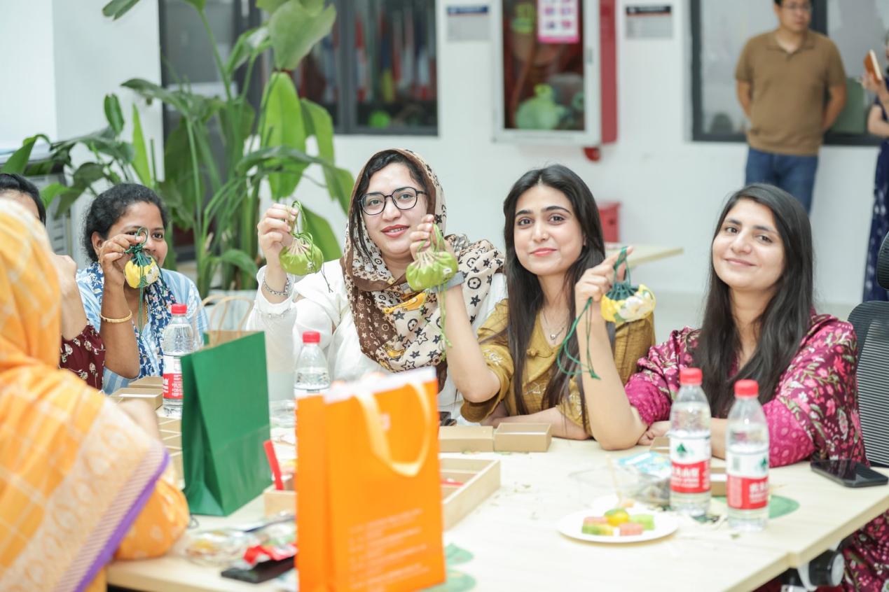 活动尾声,大家一起合影留念,香囊与门挂装点着他们的笑脸,成为这场文化之旅最美的见证。随后,茶歇时间温馨开启,大家边享用中式茶点,边聊起彼此的节日、家乡、语言与文化。每一个微笑,每一次眼神交流,都是文化沟通的桥梁。