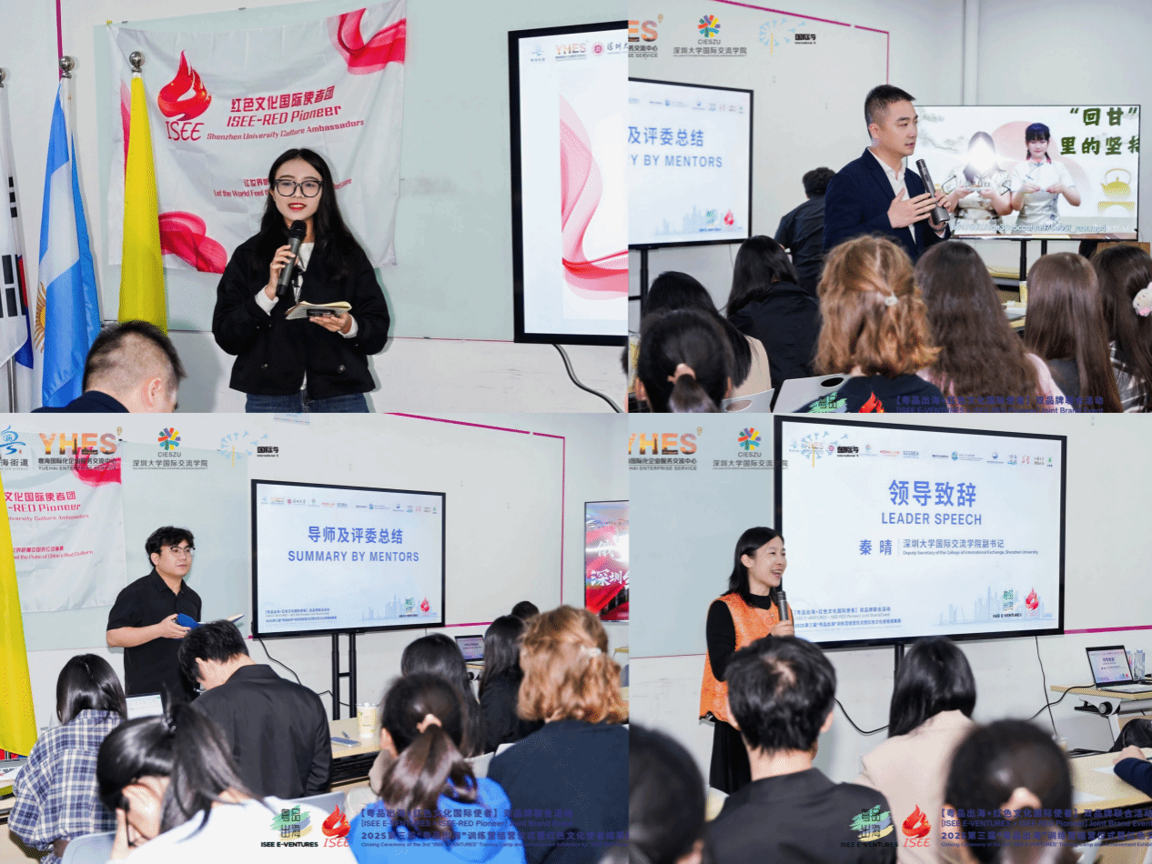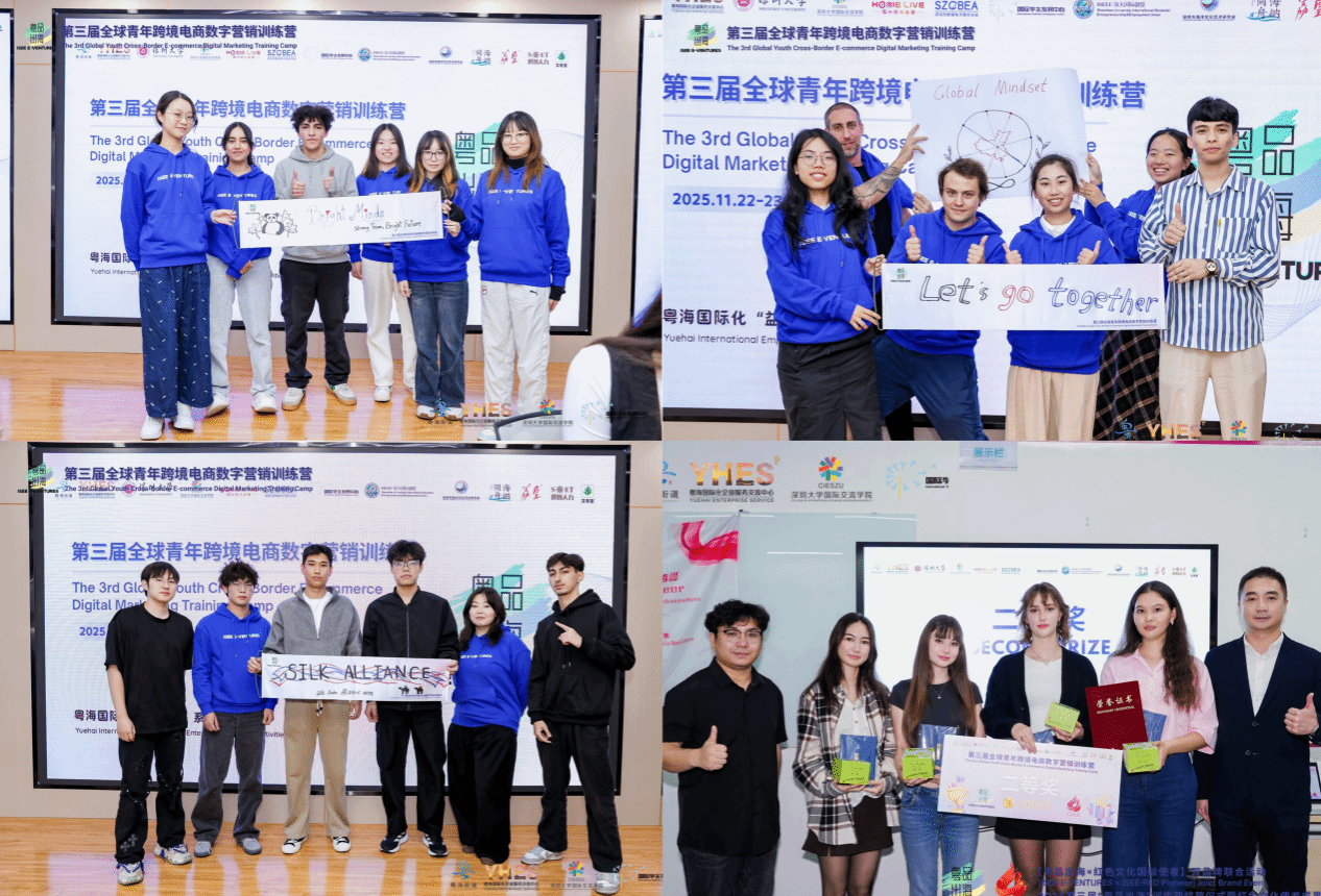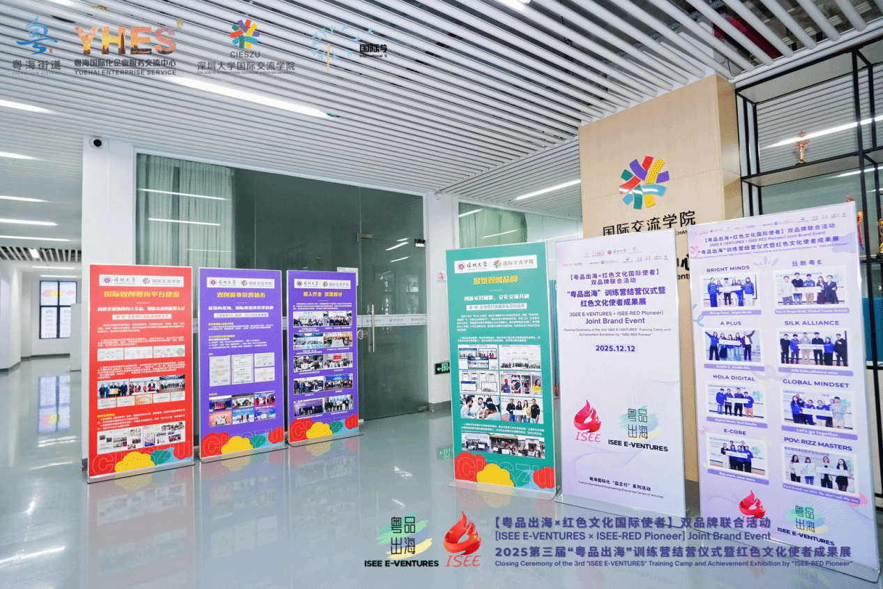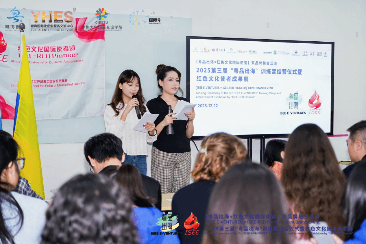 12月12日下午,深圳大学国际交流学院内氛围热烈,第三届“粤品出海ISEE E-Venture”全球青年跨境电商数字营销训练营结营仪式在此圆满收官。深圳大学国际交流学院代表、粤海街道代表及企业代表齐聚现场,共同见证这一兼具实践价值与育人意义的时刻。仪式上,深圳大学国际交流学院秦晴副书记代表学院致辞,既肯定了项目三年来的深耕成果,也明确本届训练营的核心方向——延续“跨境人才培养+直播带货推动”的经典定位,并进一步深化“一带一路”实践落地与地方产业出海需求的深度绑定,为中外青年搭建起对接全球市场的成长平台。