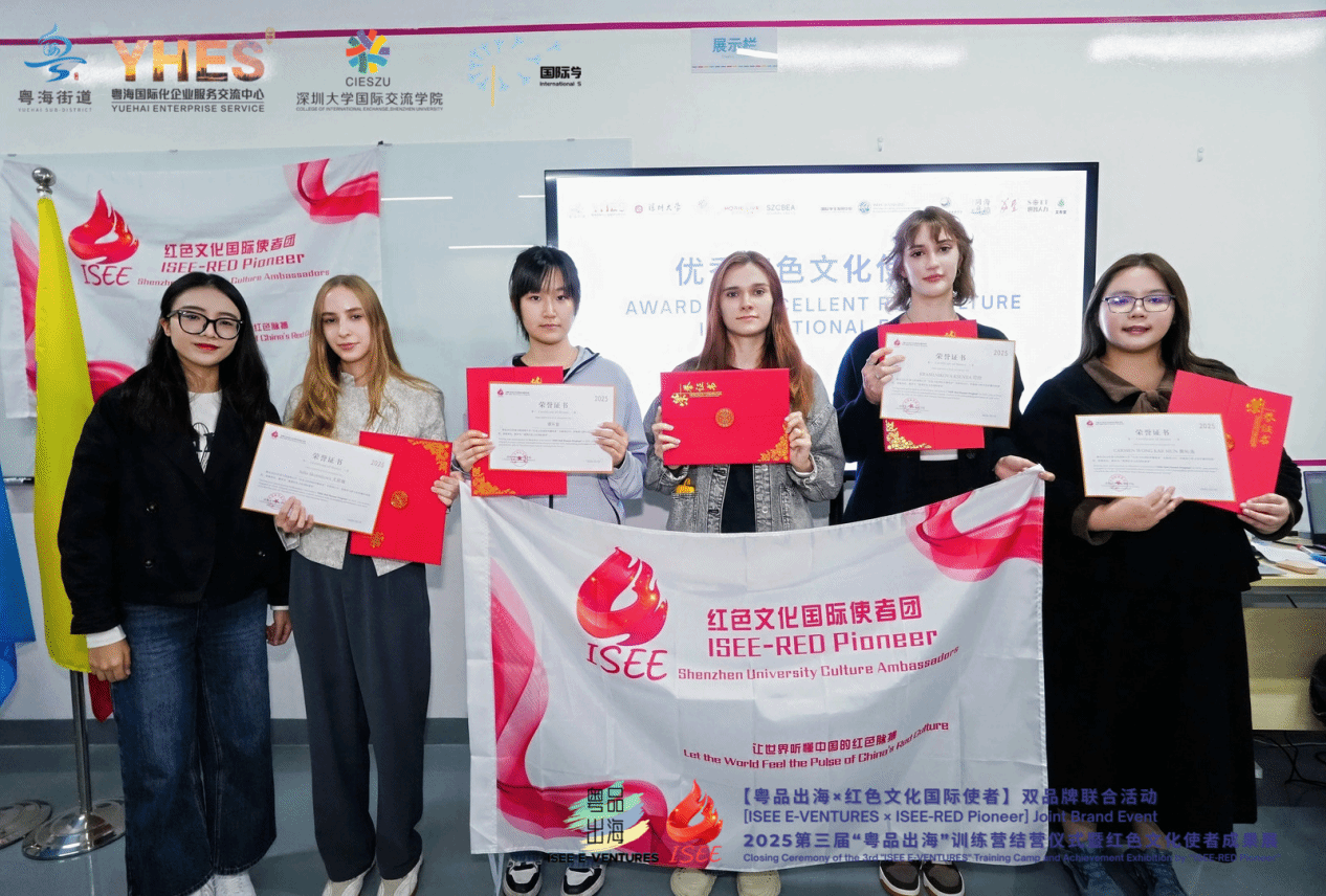 结营仪式现场亮点迭出,除了学员路演与荣誉表彰,更特别穿插深圳大学红色文化国际传播使者培育计划(ISEE-Red Pioneer Program)颁奖环节。通过一学期的实践培育,一批中外青年深耕红色文化国际传播,圆满完成2025年度实践任务。深圳大学国际交流学院党建组织员蒋冉晨老师登台致辞,高度肯定学员们突破语言与文化壁垒,以短视频、双语解说、情景演绎等多元形式,向世界传递鲜活的中国红色故事。双品牌项目负责人陈默老师和蒋老师先后为学员颁发了“红色文化使者实践证书”以及为优秀学员授予“优秀红色文化使者”奖状,表彰他们在跨文化传播中的坚守与创新。