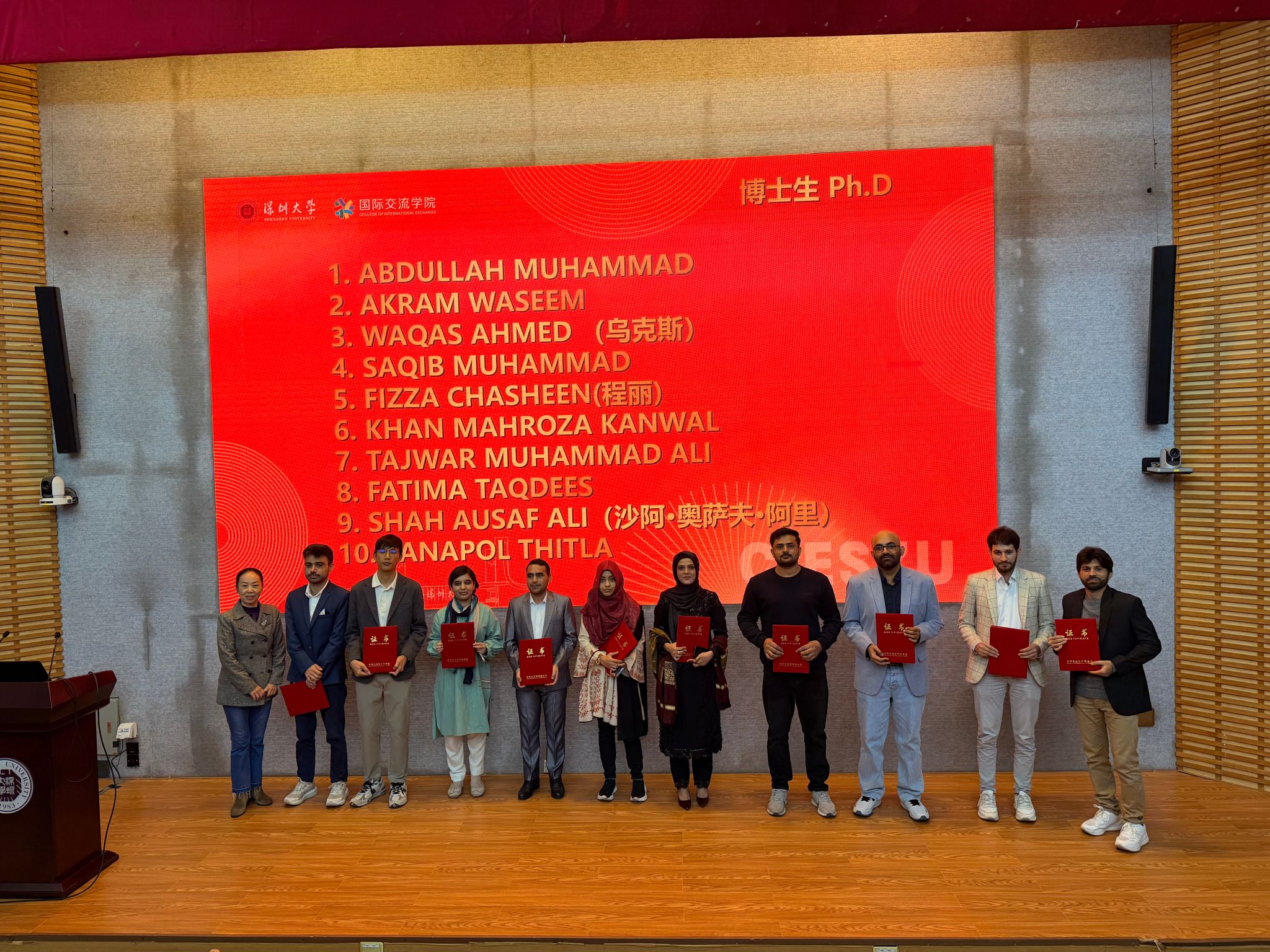 随后,陆林秘书长与秦晴副书记共同为获奖学生颁奖。此次获奖学子涵盖博士生、硕士生、本科生及语言生多个层次,来自泰国、越南、韩国、巴基斯坦等多个国家,他们在学术科研、语言学习等领域表现突出,充分展现了深圳大学国际学子的综合素质与精神风貌。