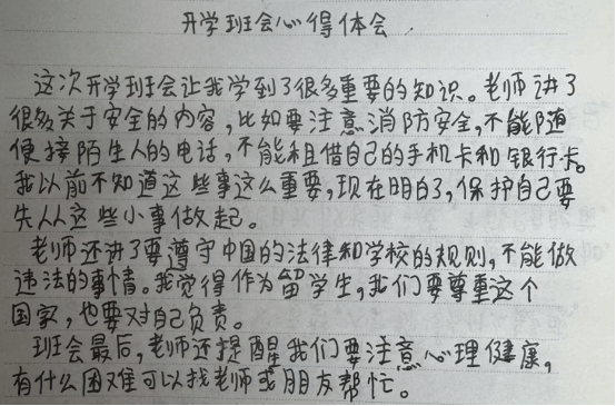 本次入学教育和主题班会不仅帮助全体国际学生明确了新学期的学习目标与在华生活的行为准则,更传递了学院对国际学生的关怀与期许。不少学生在会后表示,本次班会内容实用性非常强,既解决了自己对新学期学习安排的困惑,也清晰了解了在华生活需要遵守的相关规定,感受到了学院的细致关怀。有首次来华的学生表示,之前对出入境政策和中国的相关法律法规了解不多,这次宣讲解答了自己很多疑问,接下来会严格遵守相关规定,顺利完成在中国的学习。