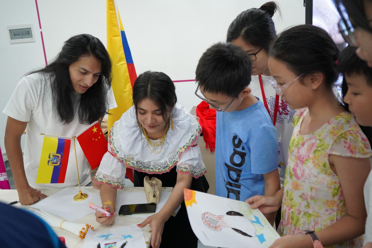 来自厄瓜多尔的艾莉老师(OLIVO BARZALLO GENESIS ELIZABETH)首先介绍了厄瓜多尔的特色风光和美食,然后摇身一变,身着民族特色服饰,带领小朋友一起舞动,绕成圆圈跳起特色舞蹈。大家一起用油画棒绘制出厄瓜多尔国鸟蓝腿鲣鸟,小朋友们都开心地和大家分享自己的作品。