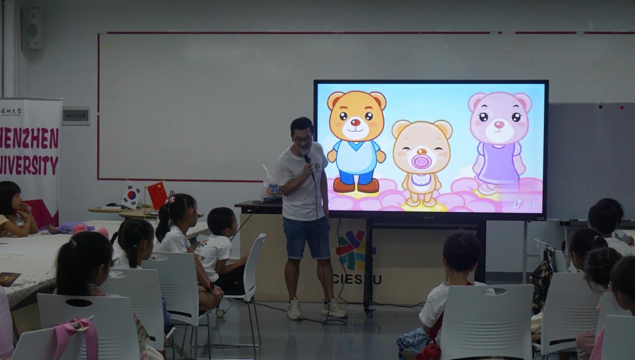 韩国的崔在佑老师(CHOI JAE WOO)在课上放起了活泼可爱的音乐——《三只小熊》。这首小朋友和家长都耳熟能详的歌曲,在崔在佑老师将韩语版和中文版手势舞的结合下,小朋友们跟随大屏幕起舞,两两组队,在快乐起舞中学习韩国文化和游戏,获得属于自己的奖励。
