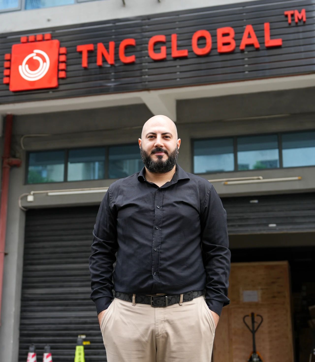 Akif poses for a photo in front of his company.