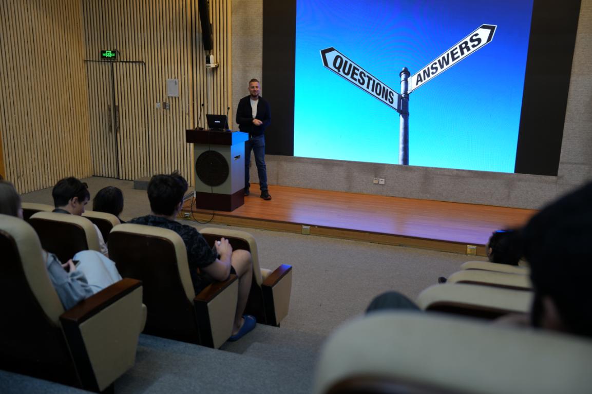 整场分享会中,FILIP全程演讲真诚流畅,充满感染力。同学们听得聚精会神,不时报以会心的笑声和掌声。在互动环节,大家纷纷举手提问,围绕汉语学习技巧、跨文化职场适应、职业规划等话题与FILIP展开深入交流。活动结束后,许多同学仍意犹未尽,围在FILIP身边继续请教,现场气氛温馨而热烈。