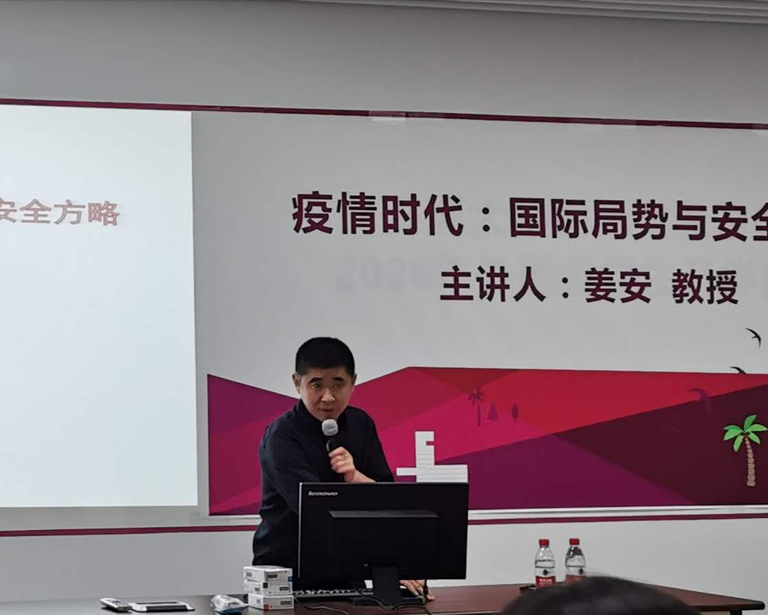 讲座伊始,姜安教授以“百年未有之变局”引出主题,在此背景之下,姜安教授从三个维度对疫情时代中的国际局势与安全方略进行了论述。新冠肺炎疫情影响之下的国际关系呈现出三个征象:第一是世界面临着新冠肺炎疫情以及由此产生的经济危机、信任危机和能力危机;第二是疫情时代由于结构性竞争导致的中美分裂;第三是疫情时代世界各国关系特别是中美关系的重构。最后,姜安教授着重分析了疫情时代新形势下中国正在遇到和即将面临的各种风险,中国政府需要勇敢面对、积极应对这些风险,并提出了相应的对策和建议。