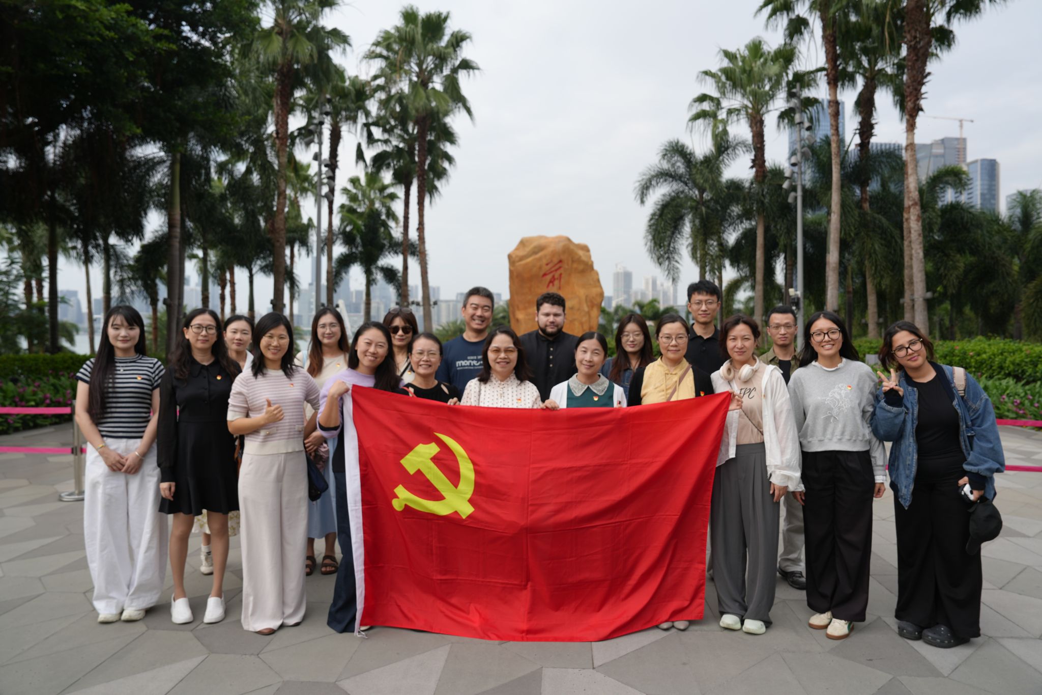 随后,学院党员教师一行前往前海石公园。在象征着改革开放精神的“前海石”前,党员们重温了习近平总书记视察前海时作出的系列重要指示精神,深刻感悟“因改革开放而生,因改革开放而兴”的时代内涵,以及“精耕细作、精雕细琢”的建设要求。通过实地感受前海从一片滩涂到现代化新城的沧桑巨变,党员们更加直观地理解了全面深化改革的重大意义和前海作为“特区中的特区”所肩负的光荣使命,激发了大家在新时代新征程上开拓创新、锐意进取的奋斗热情。