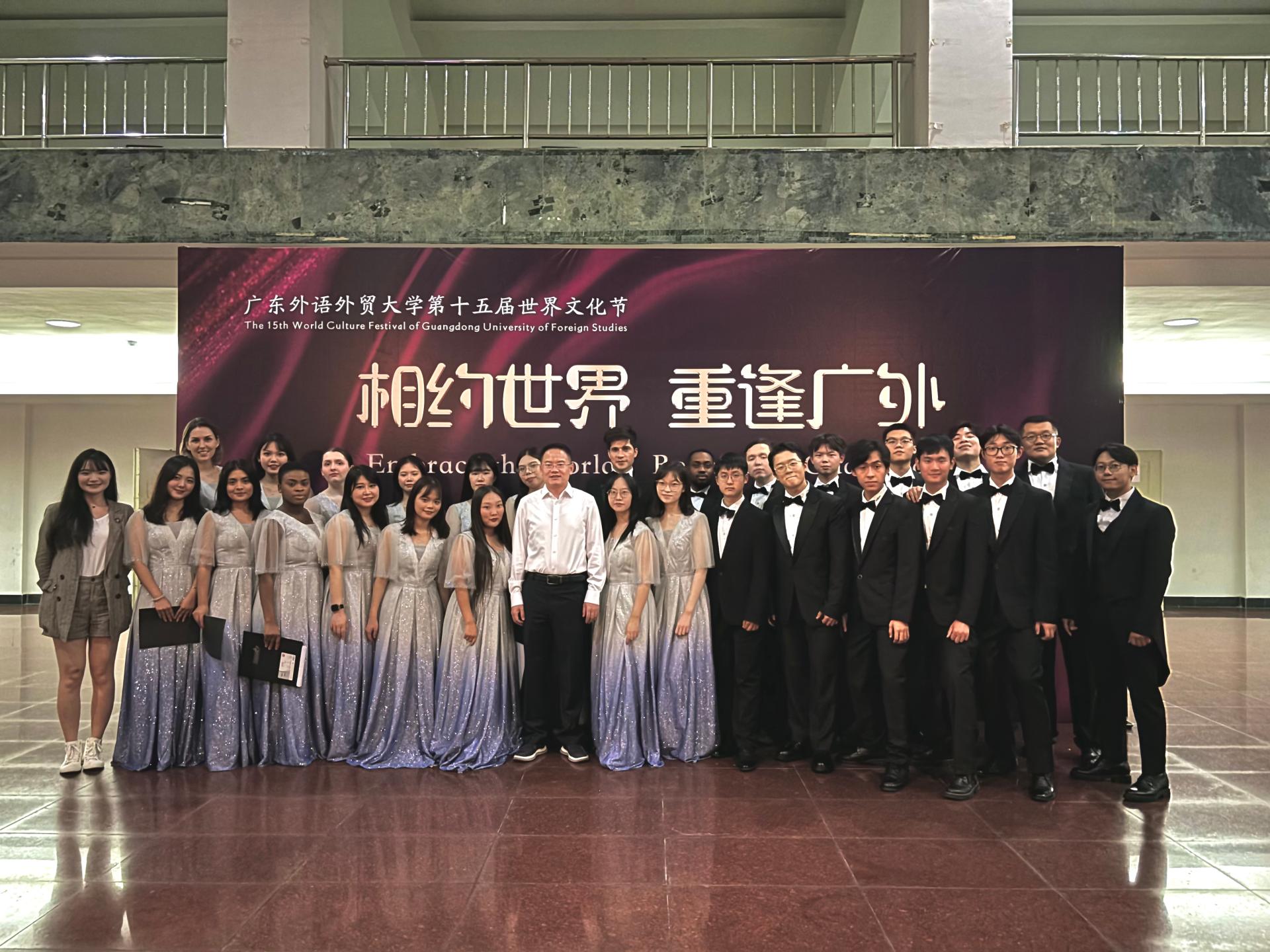 俊才星驰,欢歌飨宴。在这温暖和煦的秋日,我校国际合唱团成员来到广东外语外贸大学北校区。在世界文化节开幕式现场,同学们观看了热情洋溢的舞狮开幕秀,徜徉于广外校园中,漫步于“美食长廊”,体验各国特色风情,品尝各国地道美食,感受各国文化交融碰撞。
