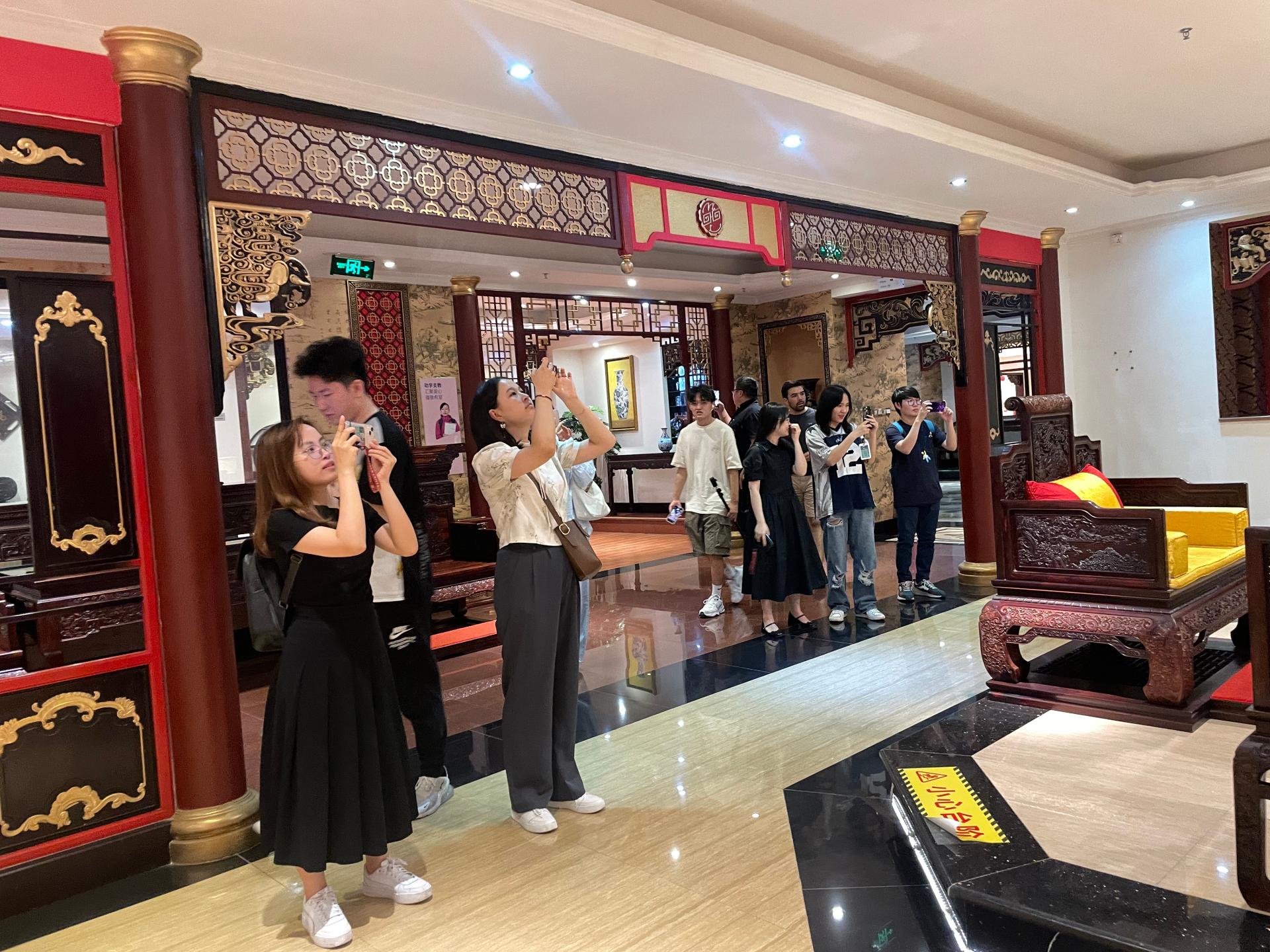 师生在观赏完国瓷经典后,又动身前往美联红木艺术博物馆。美联红木艺术博物馆以“坚持古典建筑风格与红木陈列的统一”为设计理念,在博物馆外观上注重对古典建筑艺术的继承与发扬,馆内展示品多达3800件,在博物馆展出的所有展品都具有教育性、研究性、欣赏性、新颖性,稀有性之特点。不仅传承和弘扬中国传统文化,向公众普及古典红木文化知识,提高人民群众对红木文化以及中国传统文化的认知水平。同时也秉承促进国际文化交流,实现文化的输出与输入,具体落实中央”一带一路”的方针政策的信念。