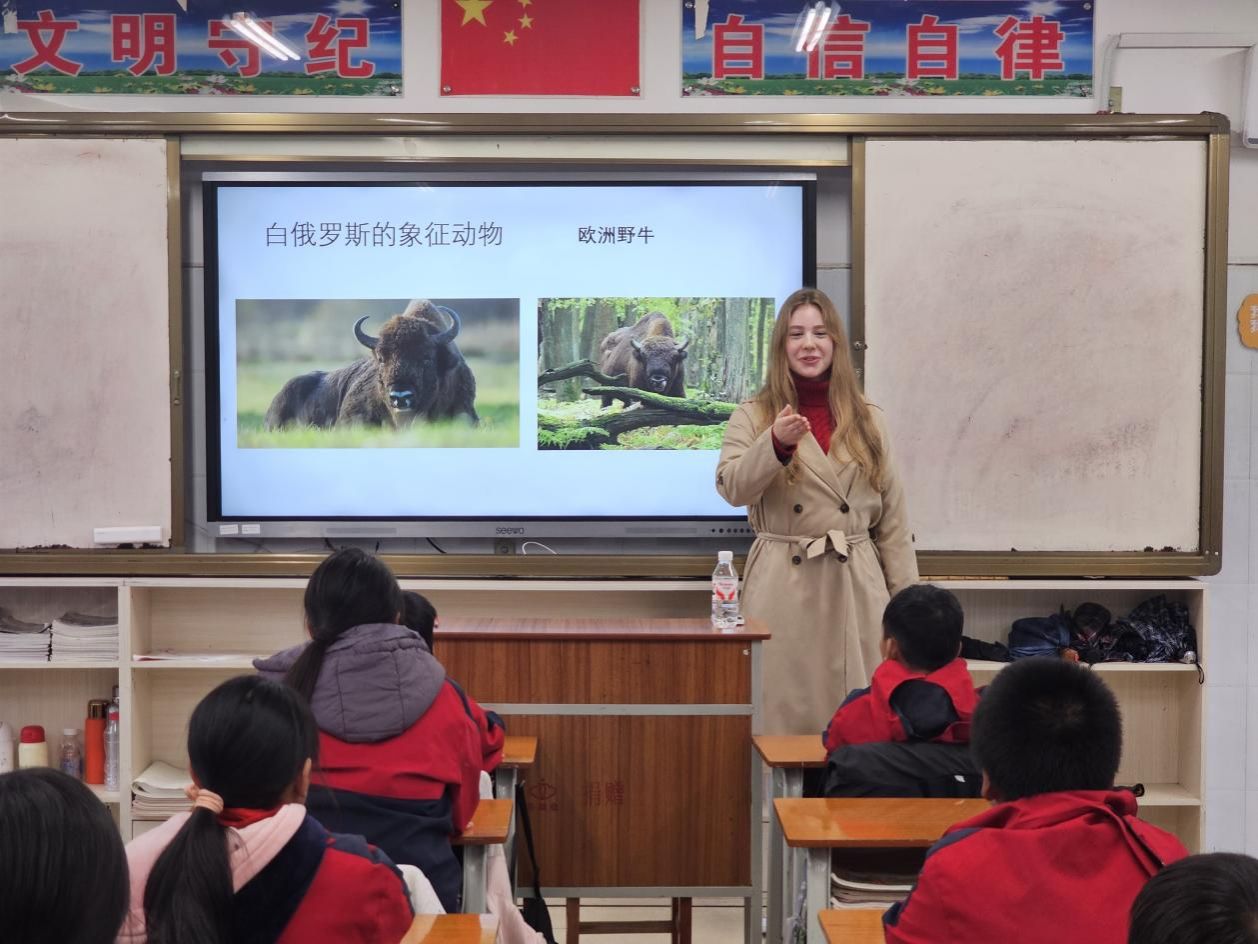 课堂上,她从自然风光讲到民族服饰,从传统土豆饼的味道延伸到白俄罗斯与中国的“一带一路”合作。孩子们好奇地询问:“白俄罗斯的冬天也下雪吗?”媞娜一边回答,一边在黑板上写下关键词,中文表达能力在实践中悄然提升。她说:“用中文讲述家乡的故事,让我对两种语言的美有了更深体会。孩子们听得认真,还教我唱中文儿歌,这种互动太美妙了。”