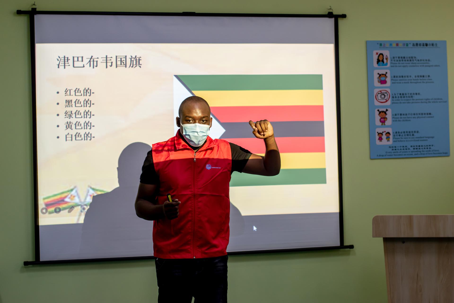 伊世达先让同学们观察津巴布韦的国旗,鼓励孩子们猜想国旗上不同的颜色所象征的意义。