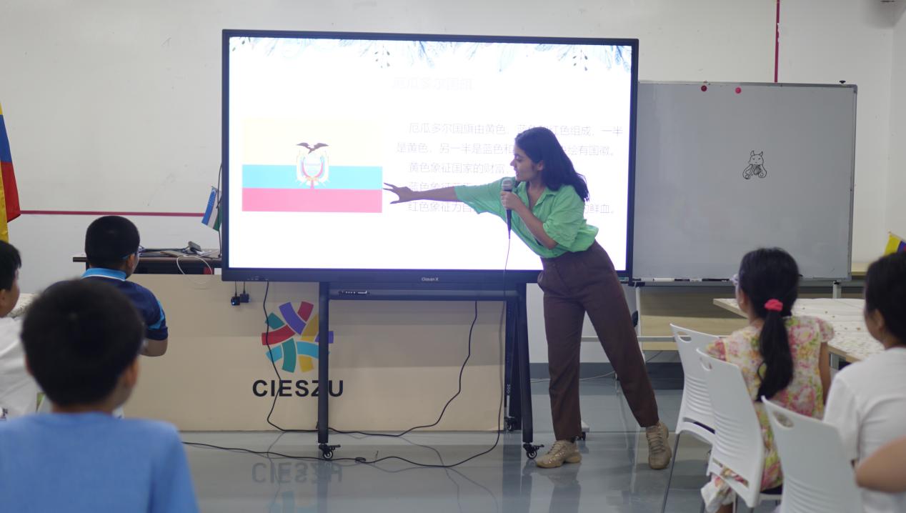 来自厄瓜多尔的艾莉老师(OLIVO BARZALLO GENESIS ELIZABETH)首先介绍了厄瓜多尔的特色风光和美食,然后摇身一变,身着民族特色服饰,带领小朋友一起舞动,绕成圆圈跳起特色舞蹈。大家一起用油画棒绘制出厄瓜多尔国鸟蓝腿鲣鸟,小朋友们都开心地和大家分享自己的作品。