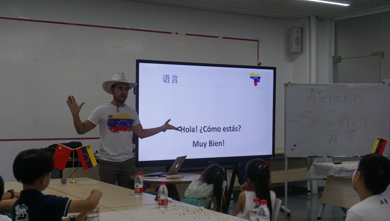 热情活泼的委内瑞拉约翰老师(VARGAS QUERALES JHON FRANK)用他诙谐幽默的话语,生动形象的肢体动作与丰富的神态表达,令小朋友们在阵阵欢笑声中熟悉了委内瑞拉这个充满了神秘色彩的国度。