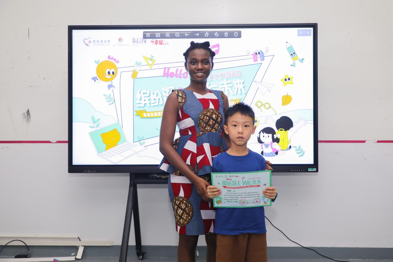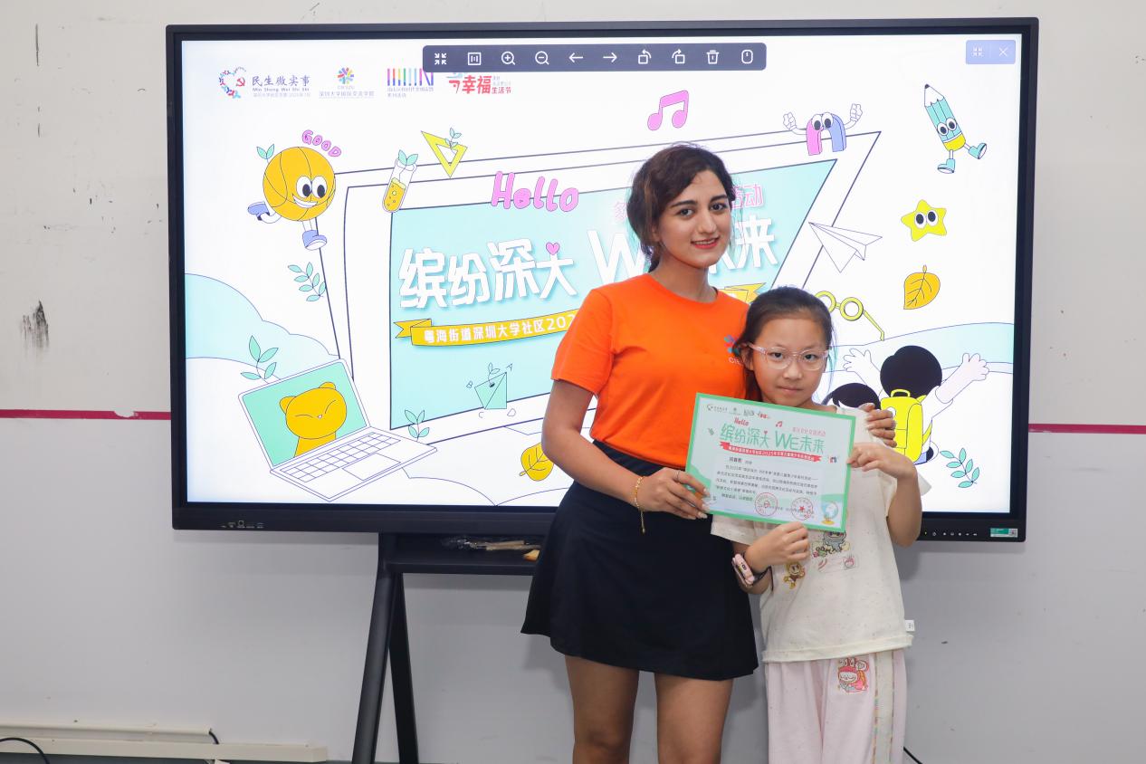 7月15日下午,闭营仪式在收获的喜悦与些许的不舍中举行。孩子们自豪地展示着他们精心制作的文化作品:墨西哥草帽画、巴西树叶足球、俄罗斯树叶蝴蝶、摩洛哥粘土锅、韩国面具、阿根廷粘土作品、以及一幅幅太空画、拓印艺术品……琳琅满目的作品汇成一个微缩的“童眼看世界”万国博览会。深圳大学国际交流学院副书记秦晴出席闭营式,充分肯定了夏令营在促进文化交流、拓展青少年视野方面的积极意义,并向无私奉献的留学生们表达了由衷感谢。