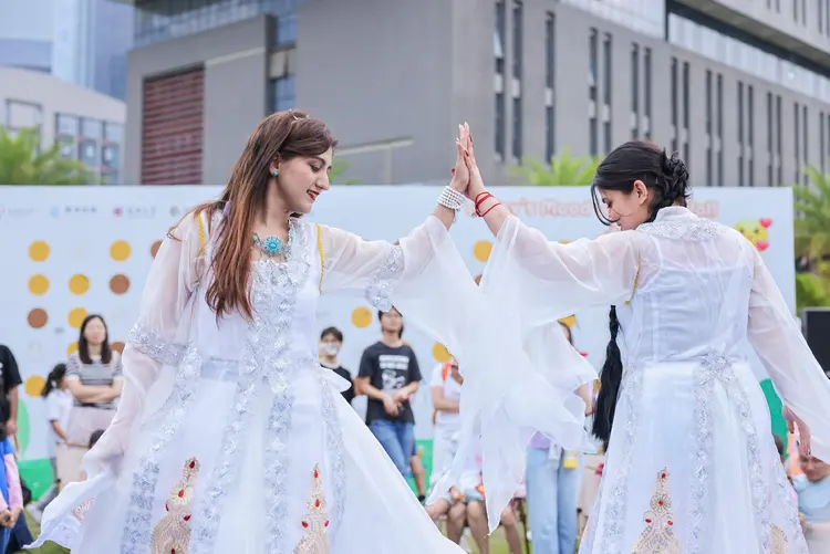 除了精彩纷呈的摊位,来自澳门城市大学、哈尔滨工业大学(深圳)、华南理工大学、广东外语外贸大学、华南师范大学、文理实验学校(集团)科创学校、深圳大学等七所粤港澳大湾区高校、中学的中外学生动情演绎各国传统民族文化特色的歌曲与舞蹈。深圳大学国际合唱团原创歌曲《东方之梦》传递出对中国的热爱与祝福,彰显了音乐跨越国界的力量。澳门城市大学艺术团的原创舞蹈《游塘忆莲》以荷花为灵感,融合澳门历史文化元素,展现了澳门从历史沧桑走向繁荣发展的历程。二十余位来自世界各国国际学生,身着各国传统服饰的留学生们款款而行,通过服装展示各国的文化特色与历史传承。演出现场热闹非凡,不时爆发阵阵喝彩与掌声。