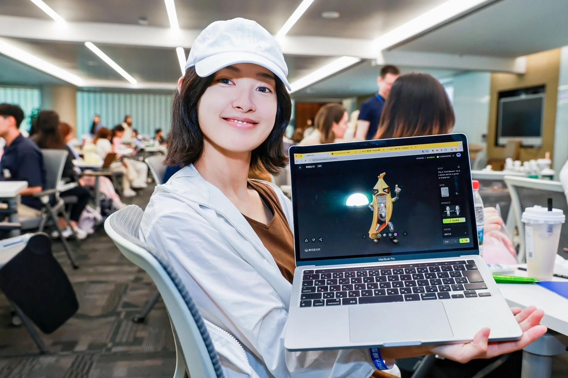 A pariticipant showcases her AI-generated work created using the Tencent Hunyuan 3D.