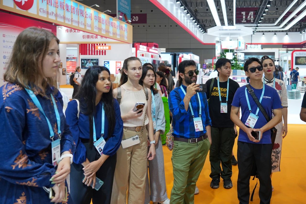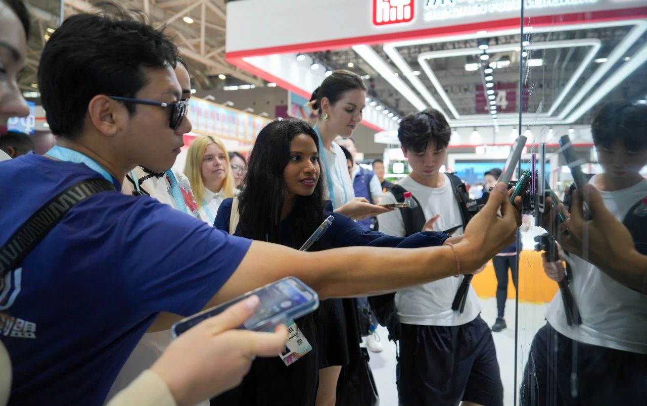 Sri Lankan student Mihindi Amasasena (3rd R) and her counterparts explore the SoonAI City Card, a joint project by EyeShenzhen and Jiatui Technology, at the Shenzhen News Group booth.