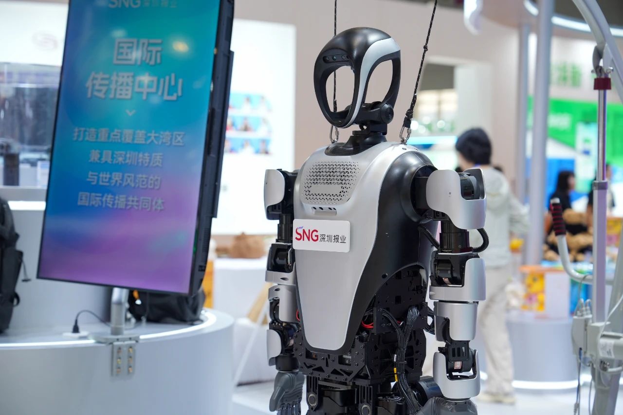 A UBTECH robot stands beside a digital display promoting the International Communication Center of Shenzhen News Group.