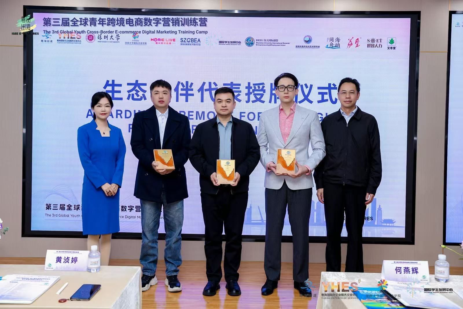 开幕式上举行了隆重的生态伙伴授牌及企业导师聘任仪式,以表彰合作伙伴的鼎力支持,并正式引入业界资深专家为学员提供全程指导。现场掌声不仅是对导师专业能力的认可,更寄托着对学员学有所成的殷切期望。同时,为鼓励学生团队在项目参与与文化交流中的积极表现,粤海街道国际志愿者团队、深圳大学红色文化国际传播使者团、深圳大学国际创盟三支国际学生团队被授予“创新先锋”称号。
